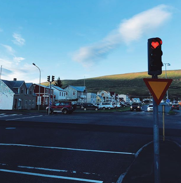 Город Акюрейри (Akureyri) — северная столица Исландии. Он маленький и уютный, запоминается своими светофорами, лампочки в которых горят в форме красного сердечка.