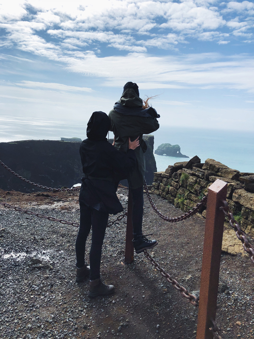 Маяк «Дирхолей» (Dyrhólaey) — название маяка дословно переводится как «отверстие в двери». Вулканические скалы, которые возвышаются прямо над пляжем и достигают в высоту около 140 метров. Это потрясающе красивое место, величественное и абсолютно безлюдное. Ветер практически сбивал с ног и даже не давал закрыть двери в машине. Чтобы сделать фото, нам приходилось буквально поддерживать друг друга.