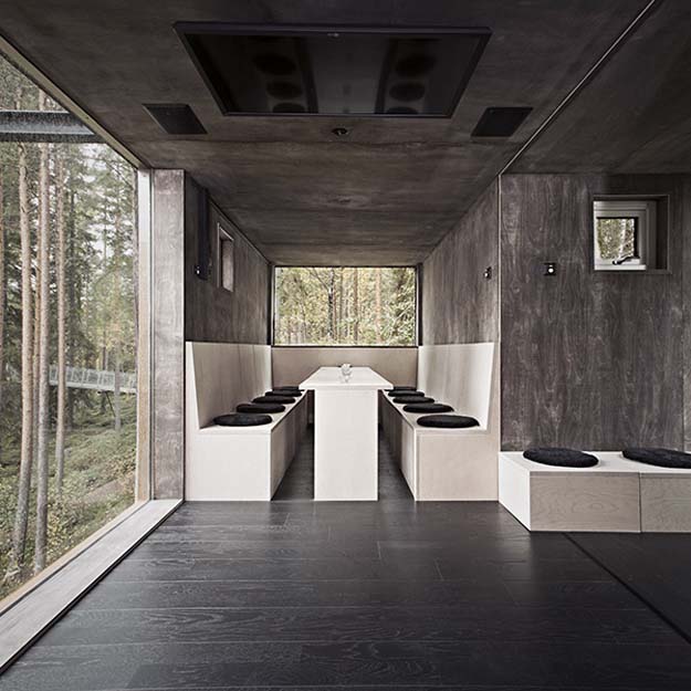 Отельный комплекс состоит из семи домов на деревьях: зеркального куба, который отражает небо, шалаша из веток, имитирующего гнездо, или красного рыбацкого домика. В меню лагерного буфета заявлены лосось, икра, мясо северного оленя и медвежатина. Можно сходить в спа, арендовать горный велосипед, удочки или каноэ, опробовать хайкинг-маршруты по сосновым лесам. Гордость местных — лоси и северное сияние в январе и феврале. Цена за ночь — около 500 евро.
