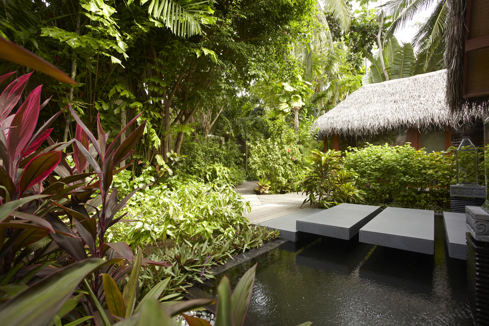 Нижняя часть деревянной крыши виллы окрашена в белый цвет, чтобы отражать естественный свет. В каждой вилле соломенная крыша из пальмовых листьев и сад с собственным цветником.