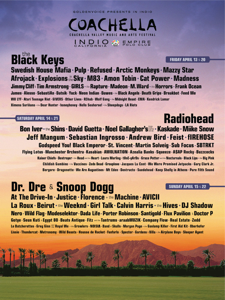 Группы The Black Keys, Radiohead и рэперы Snoop Dogg и Dr. Dre объявлены хедлайнерами фестиваля Coachella, ежегодно проходящего в США. На фестивале также выступят британские группы Florence and the Machine, Pulp и Arctic Monkeys, американские фолк-музыканты Bon Iver, шведы Swedish House Mafia и другие. В два уик-энда, с 13 по 15 и с 20 по 22 апреля, можно будет услышать также Justice, Neon Indian и David Guetta. Британский электропоп-дуэт La Roux впервые представит песни со второго альбома, выход которого, как и презентация первого сингла, еще не обозначен.