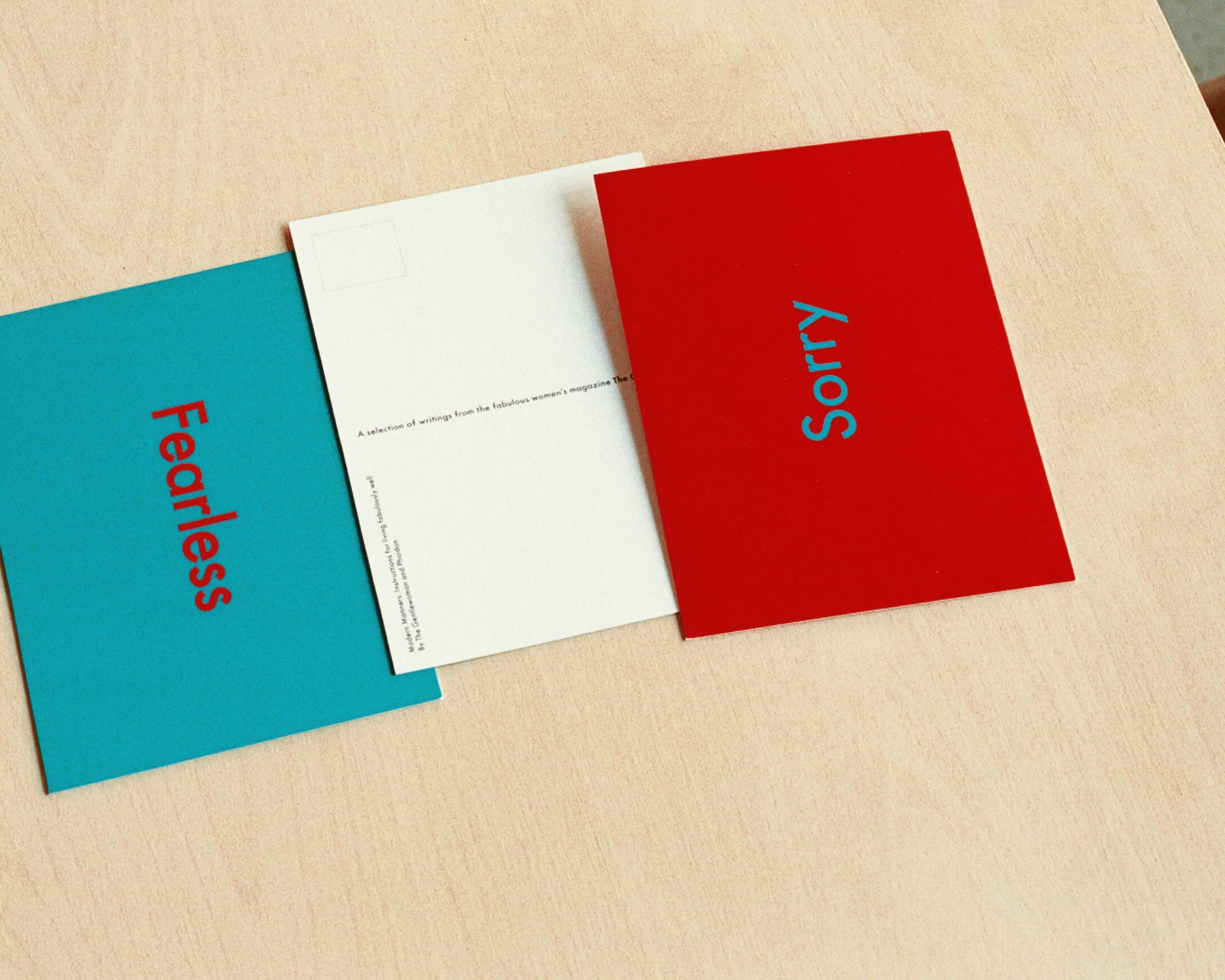 В набор вошло десять открыток, каждая из которых содержит утверждение из книги, отражающее разнообразие вежливости 21-го века. Например, «Извинение», «Бесстрашие». Открытки представлены в красном и бирюзовом цветах. Приобрести их можно на сайте журнала.
