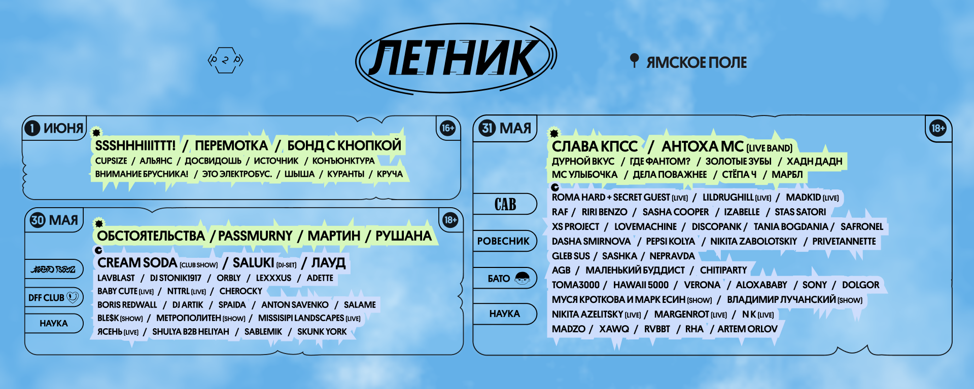 Фестиваль, который раньше был известен как «Ветерок», возвращается в 2025 году под новым именем — «Летник». Трехдневное музыкальное событие растянется на всю территорию Ямского поля, превратив район в огромную фестивальную зону с пятью сценами. Днем — лайв-выступления, активности, гейм-зоны и еда на любой вкус, ночью — танцы до рассвета на вечеринках.