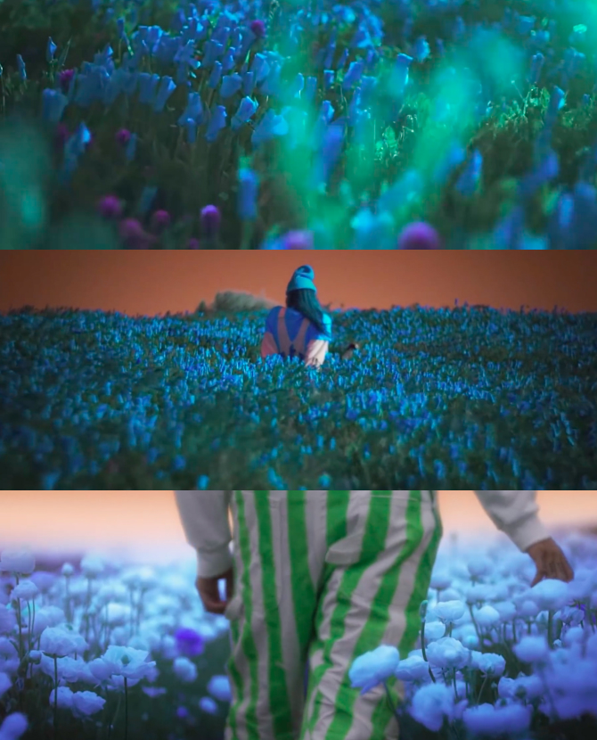 Билли Айлиш гуляет по полю с синими цветам в клипе на на песню «Everything I Wanted»