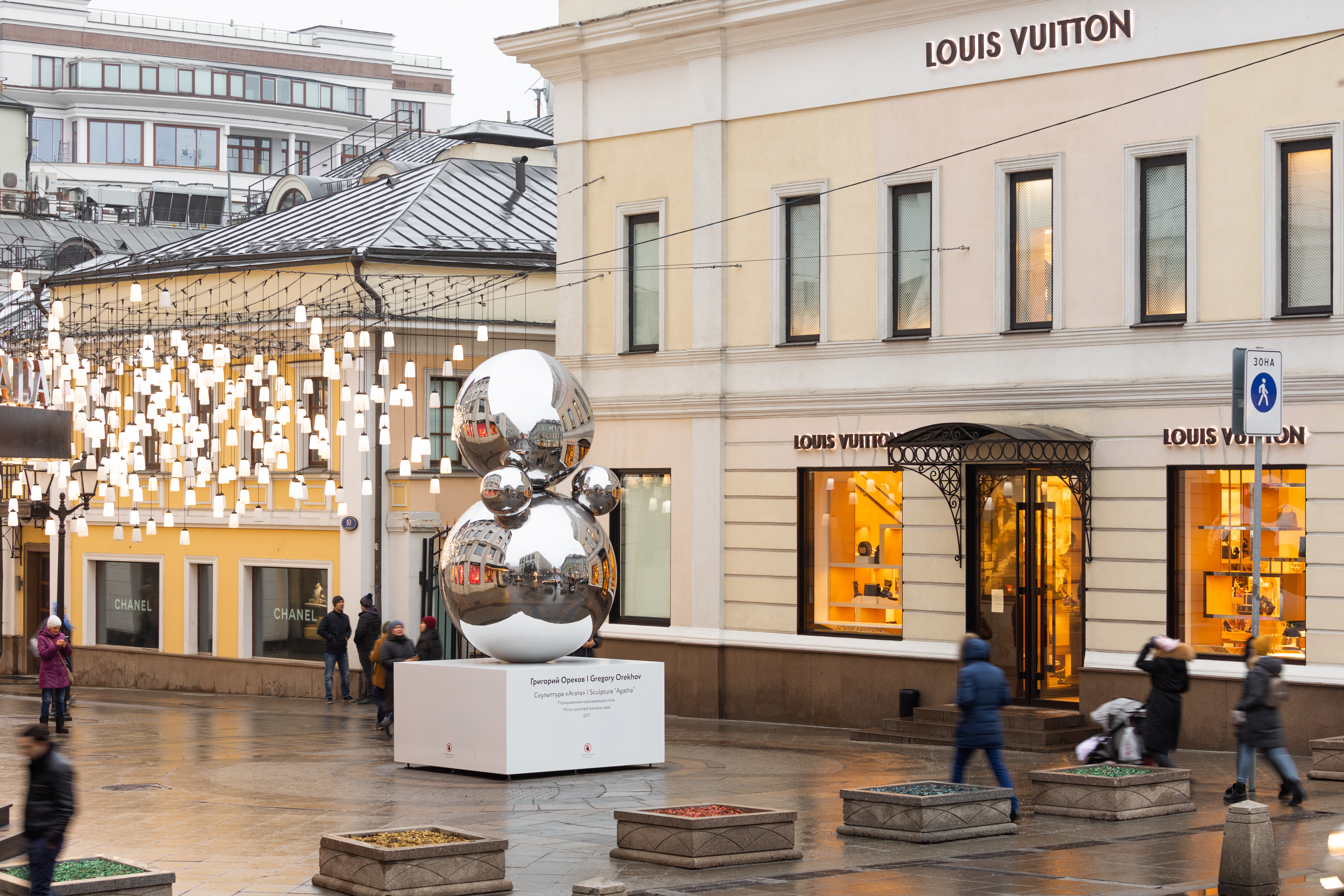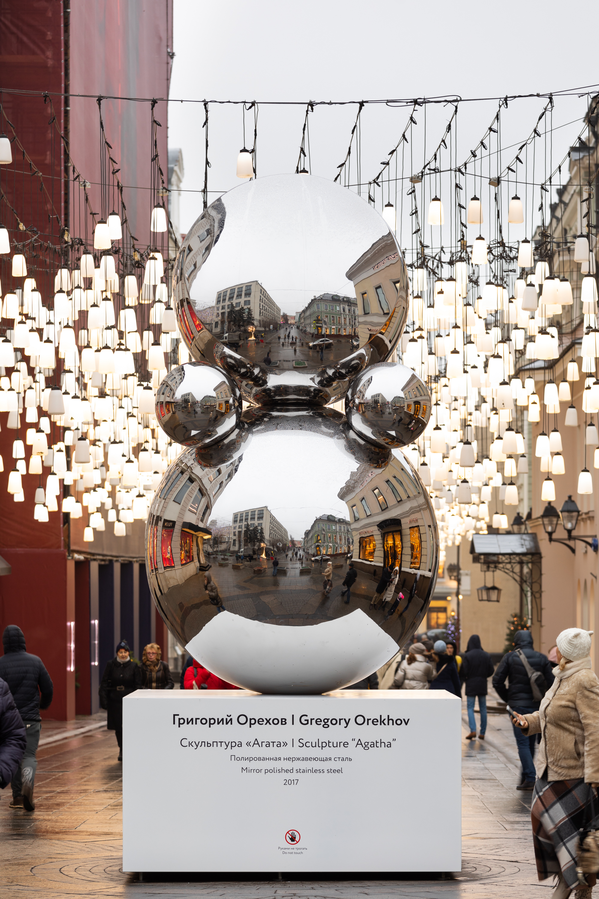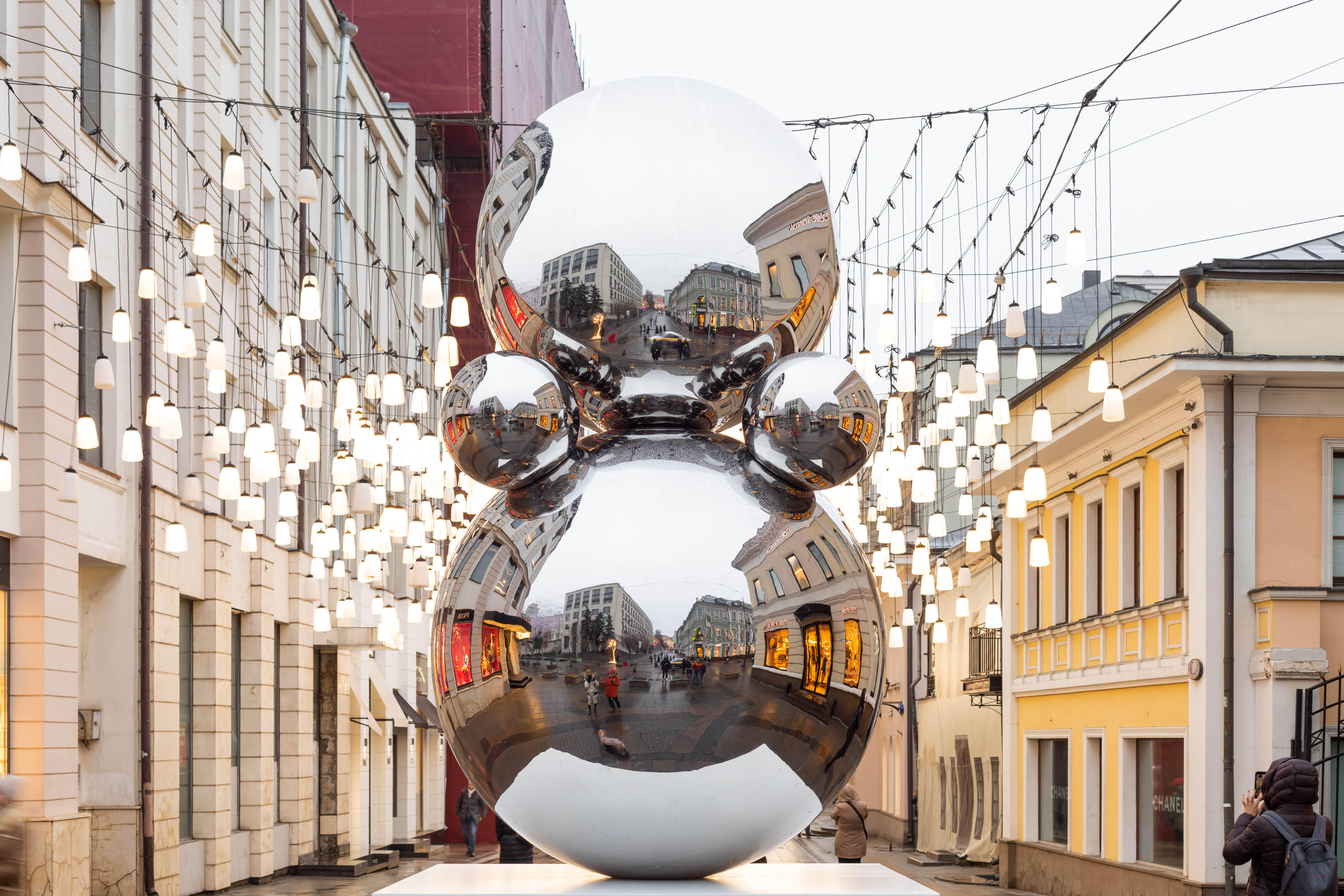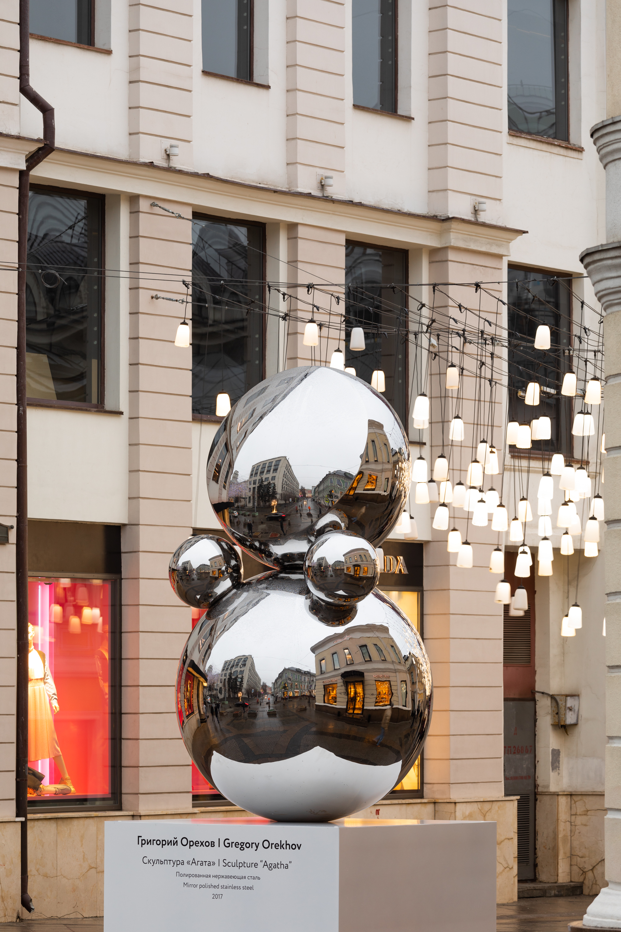 В Столешниковом переулке теперь можно увидеть пятиметровую скульптуру Григория Орехова «Агата», выполненную из нержавеющей стали, отполированной до зеркального состояния. Художник работал над ней около года.