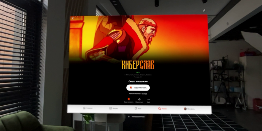 Платформой можно пользоваться в очках AVP: доступны медиа, энциклопедия фильмов и сериалов, просмотр контента в HDR и разрешении 4К, а также функция загрузки на устройство, чтобы просмотр можно было продолжить оффлайн.