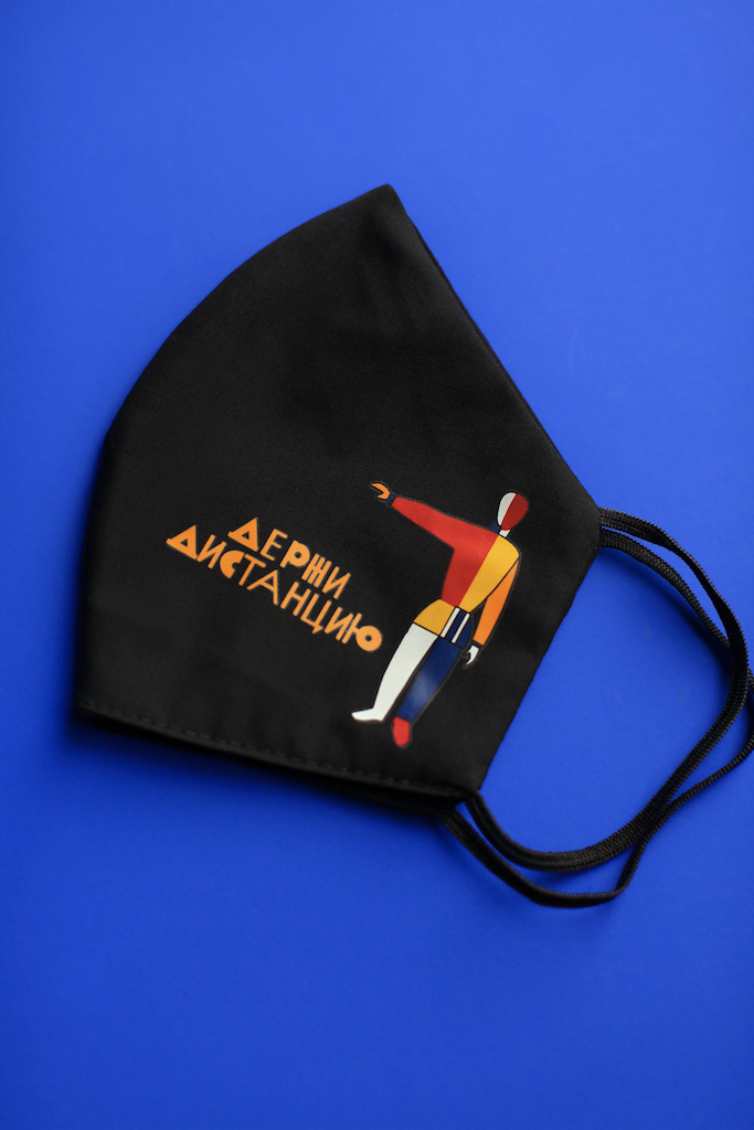 Русский музей представил защитные маски, вдохновленные творчеством Казимира Малевича и созданные в сотрудничестве с петербургским брендом Razgulyaev x Blagonravova. Верхний слой изделий с надписью «Держи дистанцию» выполнен из дышащего хлопка, внутри — медицинская фильтрующая ткань. Прилегающий к лицу слой сделан из натурального тонкого хлопка.