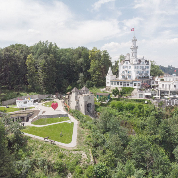Новая городская достопримечательность появилась по инициативе российского бизнесмена и мецената Александра Лебедева. Десять лет назад он купил отель Сhateau Gutsch и восстановил его, пригласив поработать над интерьерами американского дизайнера Мартина Булларда. «Место знаменитое, — говорит Лебедев. — В разное время здесь бывали такие выдающиеся личности, как Лев Толстой, королева Виктория, Чарли Чаплин, Софи Лорен, Альфред Хичкок. Нам удалось сделать отель рентабельным, что в Швейцарии большая редкость».