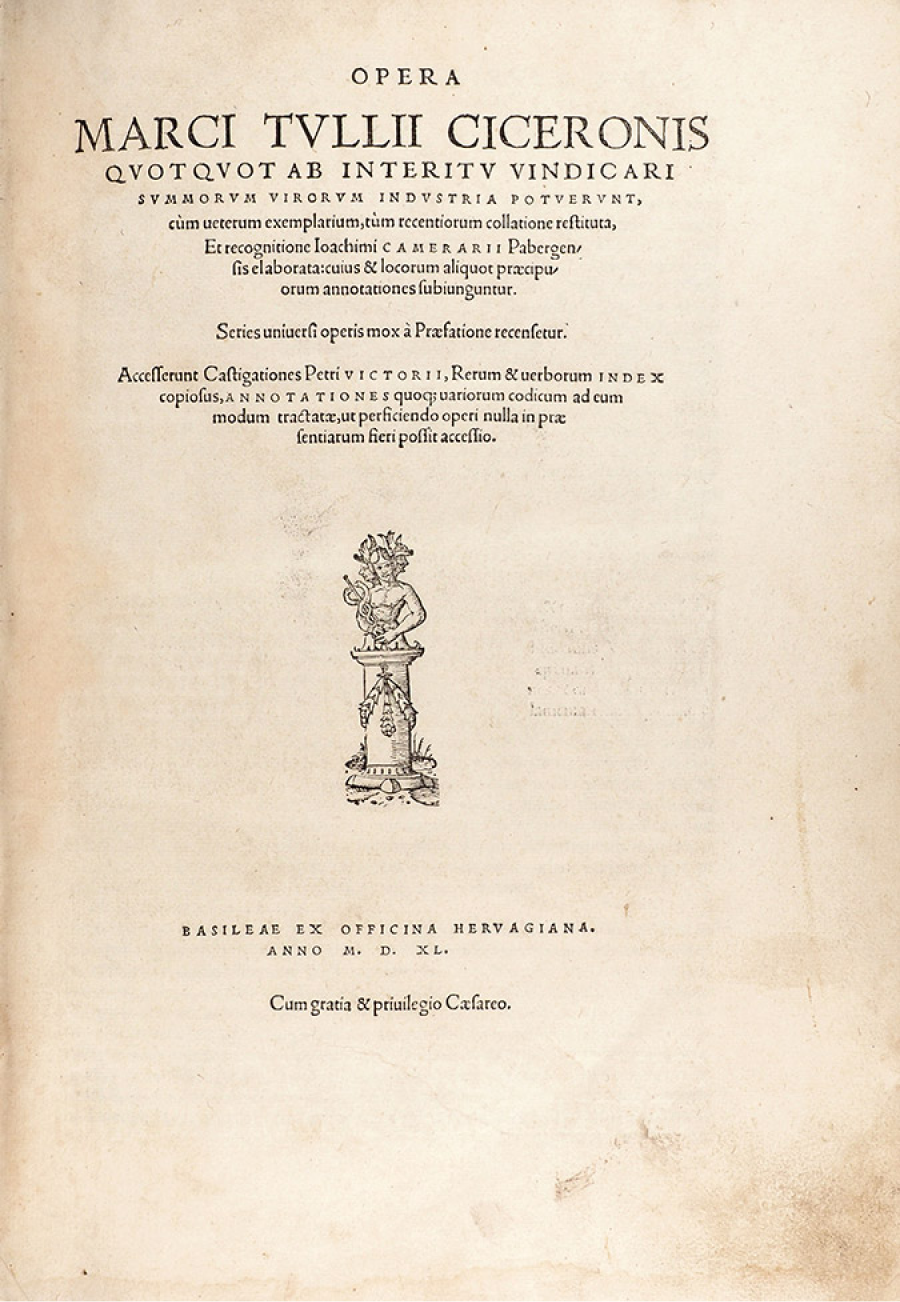 На торгах будет представлено второе издание собрания сочинений Цицерона. Оно вышло в базельской типографии немецкого печатника Иоганна Хеервагена на латинском языке в 1540 году. Полное название книги — «Цицерон. Труды Марка Тулия Цицерона, многие из которых были спасены от исчезновения трудолюбием величайших мужей, восстановлены путем сопоставления старых и новых списков и отредактированы Иоахимом Камерарием: с приложением аннотаций к наиболее важным местам».