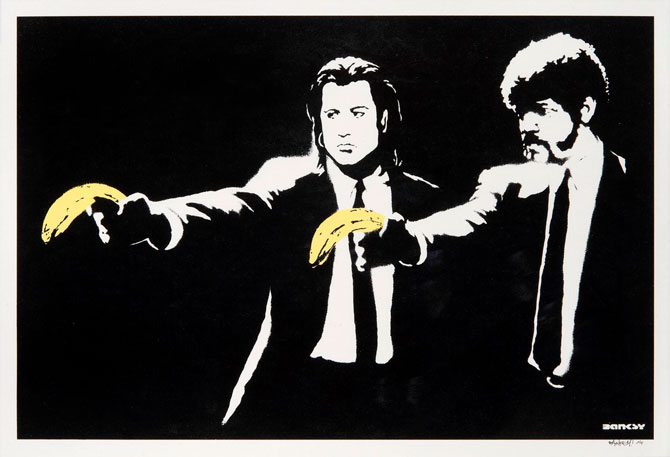 Работа граффити-художника Бэнкси с пародией на фильм «Криминальное чтиво» ушла с молотка на торгах за 125 тысяч фунтов стерлингов. Принт, изданный в 2004 году, воссоздает одну из самых знаменитых сцен «Криминального чтива» Квентина Тарантино: персонажи Джона Траволты и Сэмюэля Л. Джексона стоят в черных костюмах и держат в руках вместо пистолетов бананы.