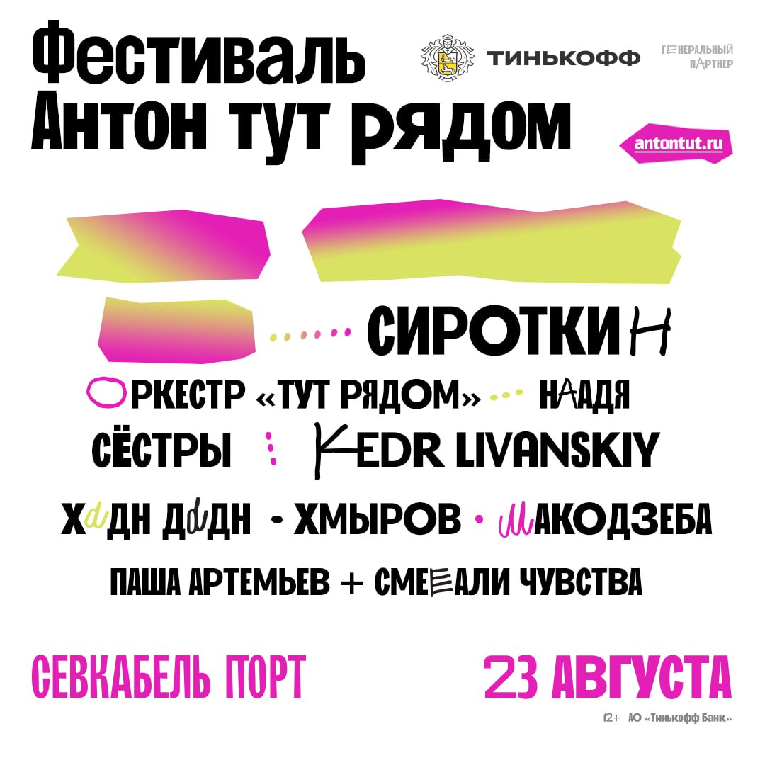 Напомним, ранее музыкальный фестиваль «Антон тут рядом» объявил первую волну артистов. В лайнапе представлены Kedr Livanskiy, группы «Наадя» и «Макодзеба», а также инклюзивные оркестр «Тут рядом» и эмбиент-эксперимент «Смешали чувства».