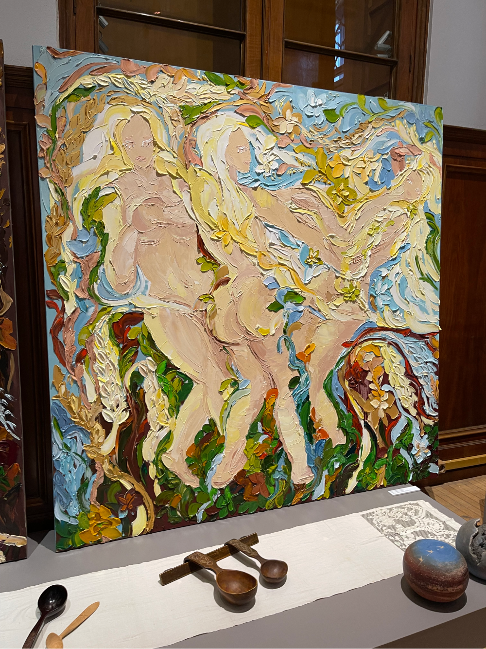 На выставке Екатерина Комбарова представила две новые работы «Царица» и «Весенний хоровод». Они написаны маслом и каждым мазком мастихина отсылают к древнему обрядовому танцу — хороводу. Фактура, нежные природные оттенки, изящные женские силуэты рассказывают о сакральной силе и глубинной философии действия.