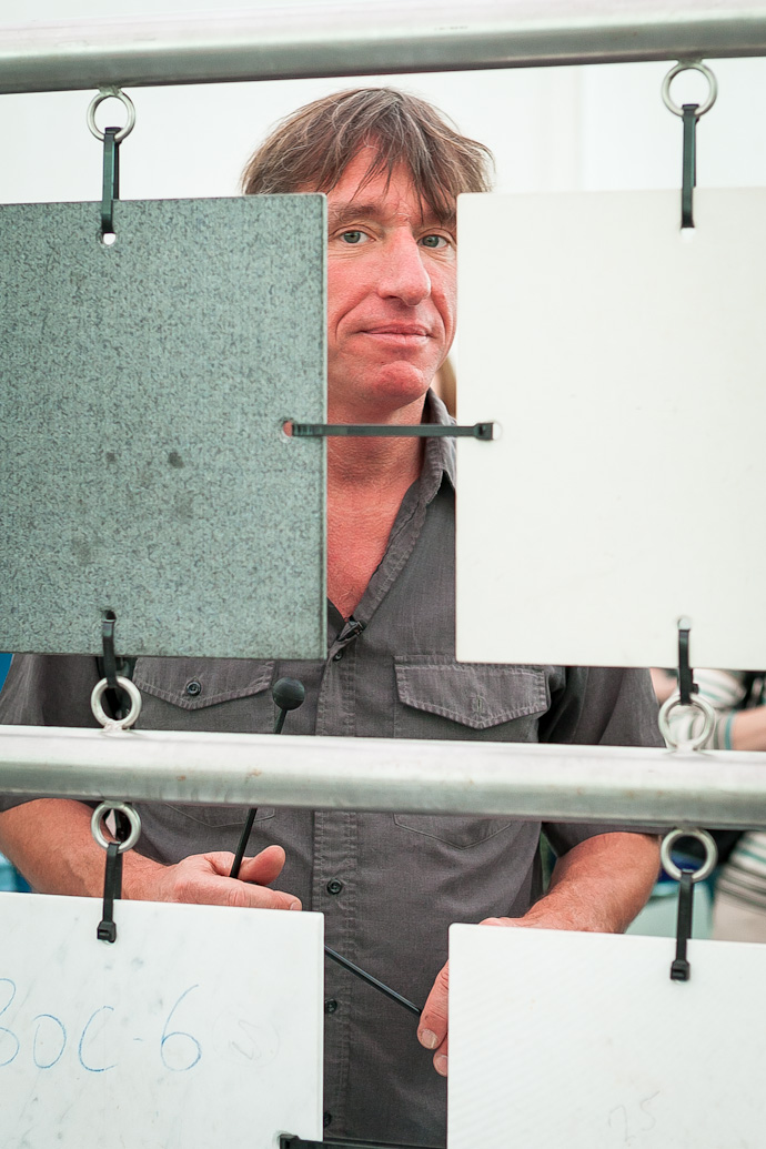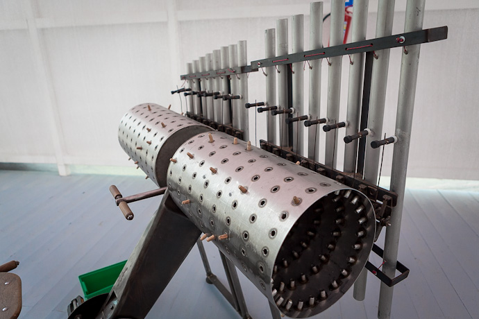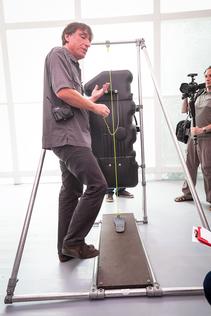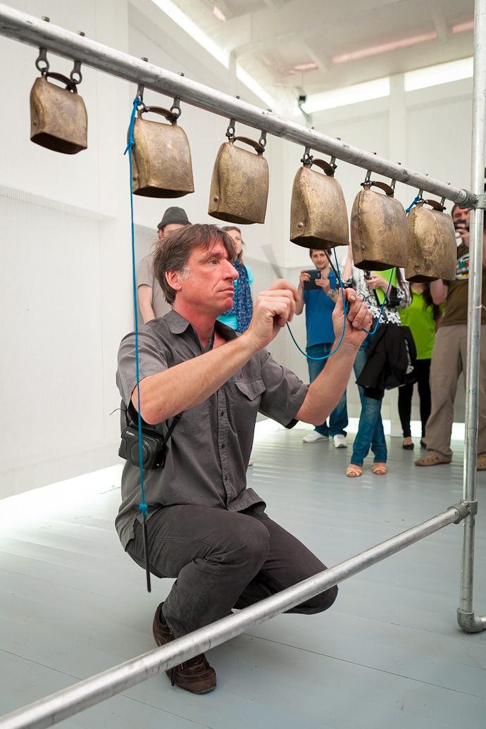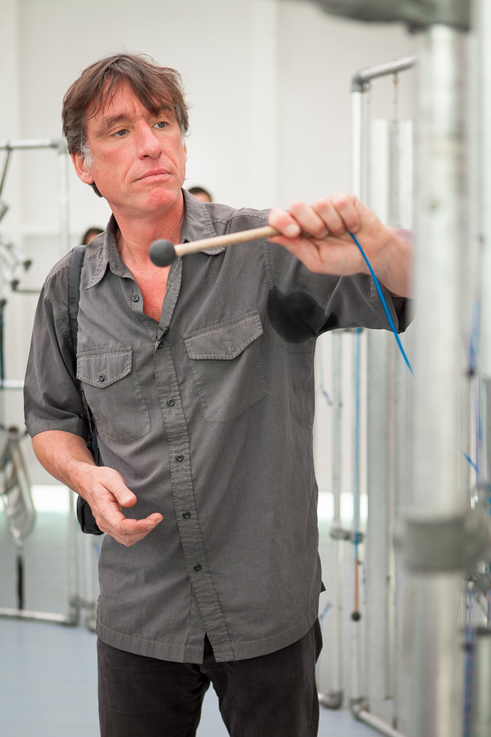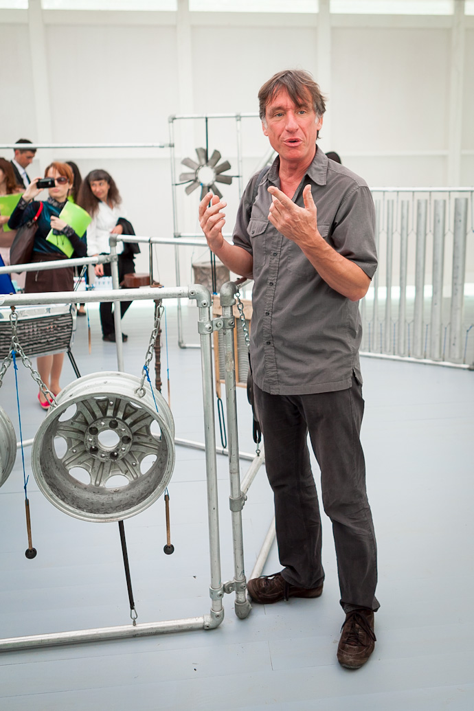 Брадке не только рассказал о каждом из представленных экспонатов, но и показал, каким образом можно на них поиграть. Эта выставка будет особенно интересна детям, утверждает создатель необыкновенных "музыкальных машин", и сам, будто становясь ребенком, увлеченно постукивает по деревянному, "земляному" ксилофону и составленному из десятков бытовых предметов металлофону, крутит педали "Машины-композитора" и стучит по "Барабану с переменным давлением".