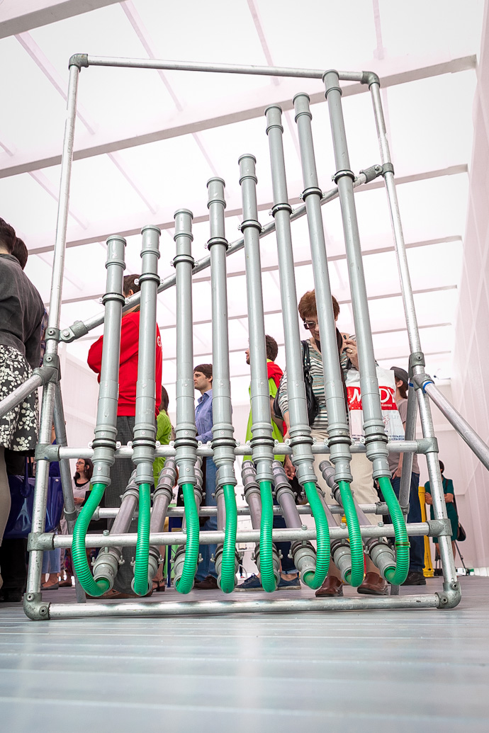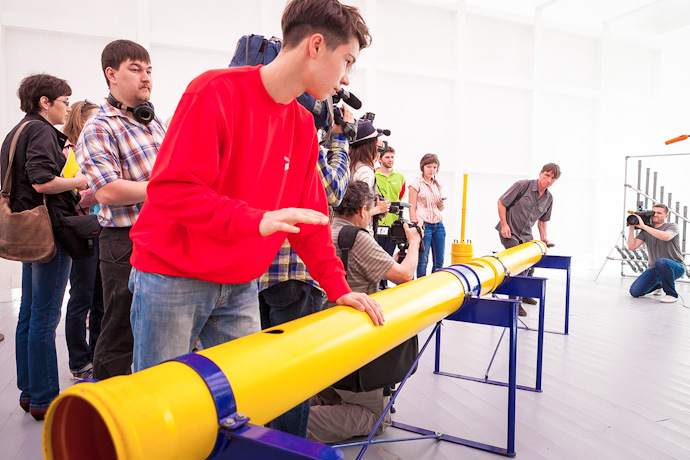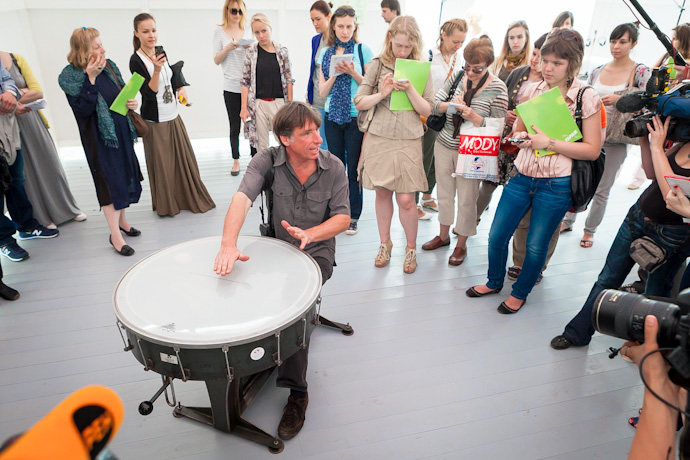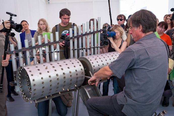 28 июня в новом пространстве Центра современной культуры "Гараж" открылась выставка "Потрогай музыку", позволяющая зрителям прикоснуться к самым необычным инструментам по проекту Михаэля Брадке, извлечь из них разнообразные звуки и представить себя ученым из секретной лаборатории по производству музыки. Для этого в Москву привезли тридцать масштабных интерактивных инсталляций из коллекции знаменитого немецкого Мобильного музея музыки в Дюссельдорфе. Создатель музея Михаэль Брадке также приехал в столицу на открытие выставки и провел экскурсию по залам нового летнего павильона "Гаража".