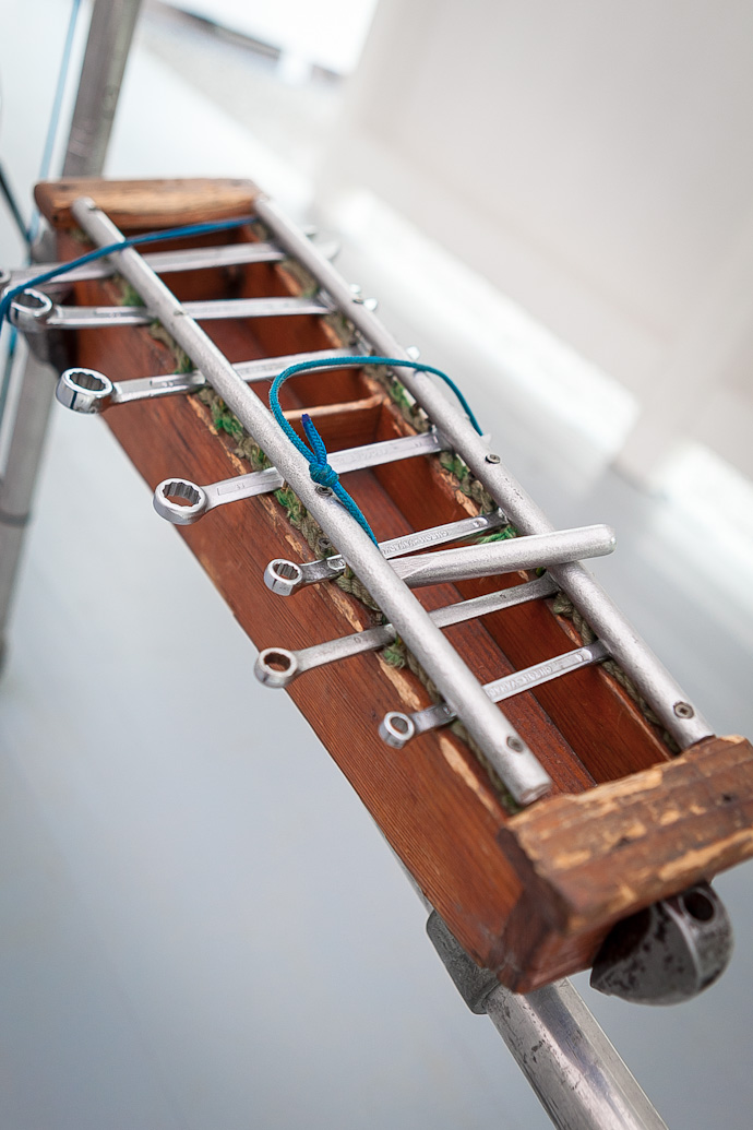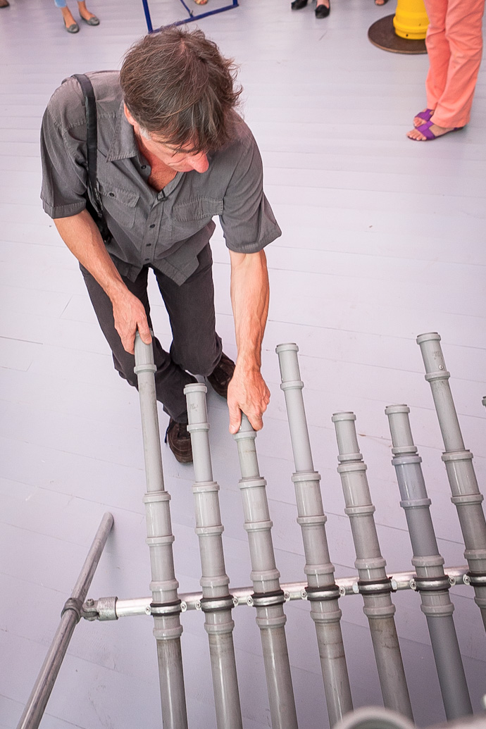 Гости экспозиции погружаются в удивительный мир звуков, которые издают самые обычные железные кастрюли и стеклянные бутылки, каменные плитки и гигантская металлическая флейта. Михаэль Брадке, словно вдохновившись стихотворением Маяковского, играет и "ноктюрн на флейте водосточных труб". Обыкновенные трубы, которые можно найти под раковиной, стали материалом для нескольких инструментов мастера — "Органа с насосом", звук из которого извлекается путем качания насосов, и "Ударного органа", на котором можно поиграть с помощью пляжных шлепанцев.