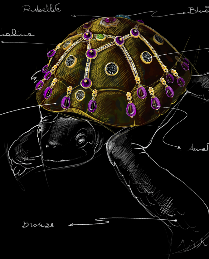 Ювелирный дом Bvlgari и итальянский художник Франческо Веццоли создали скульптуру под названием «Tortue de Soirée» («Вечерняя Черепаха»). Это черепаха с латунным панцирем, украшенным аметистами, рубеллитами, цитринами, перидотами и топазами. Всего в декоре скульптуры было использовано 43 драгоценных камня и девять древнегреческих монет из серебра.