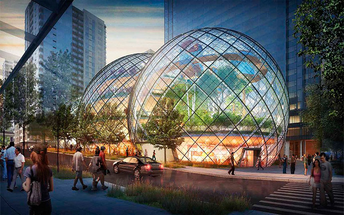 Компания Amazon обнародовала эскизы своего нового офиса в Сиэтле, где, как известно, находится ее штаб-квартира. На рисунках изображены объемные смежные сферы, сплошь застекленные и визуально напоминающие большой зимний сад. В официальном заявлении Amazon сообщается, что у столь смелого проекта есть множество положительных практических качеств, которых зачастую не хватает типичным городским сооружениям и офисным помещениям.