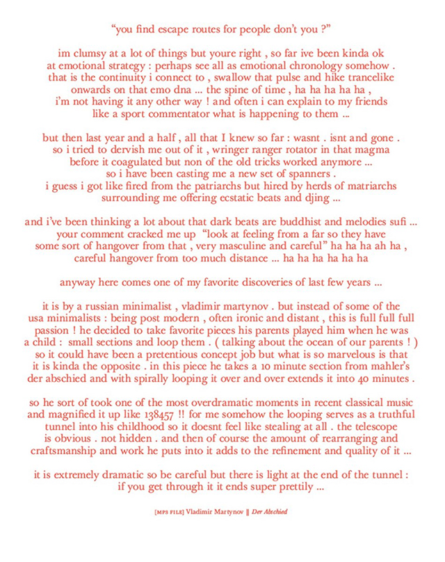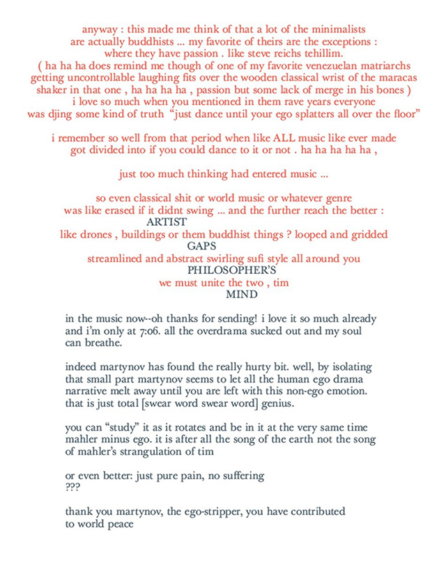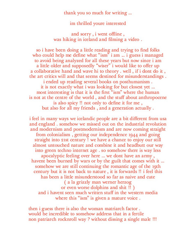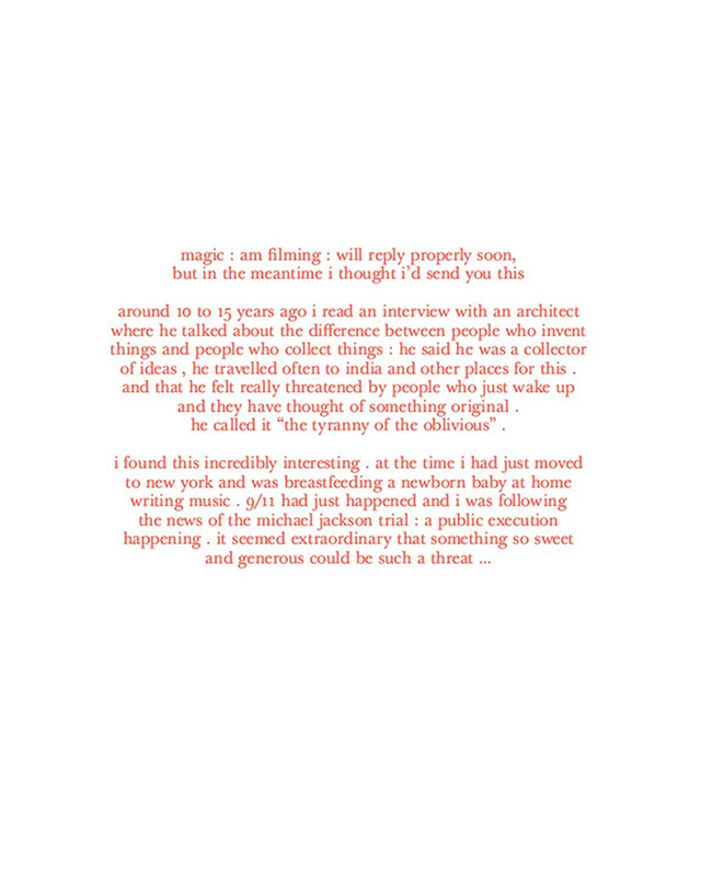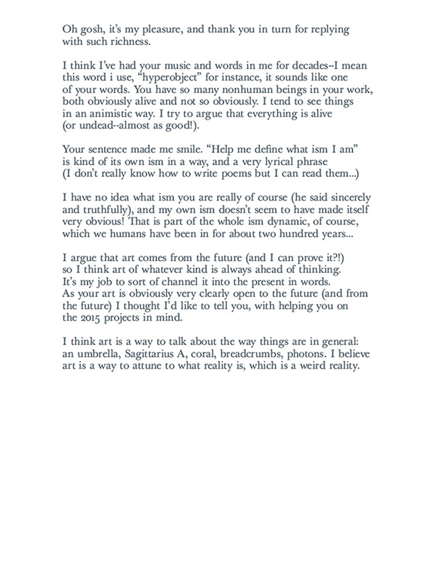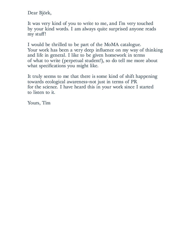 Любопытно, что в одной из семи частей издания представлена личная переписка певицы с философом Тимоти Мортоном. Мортон, который в настоящее время преподает в Университете Райса в США, занимается метафизикой, экологией и, в том числе, вопросами самоидентификации, с которыми к нему и обратилась исполнительница.