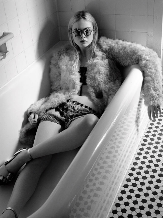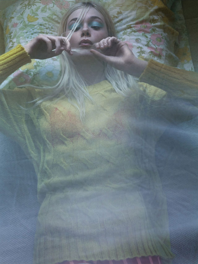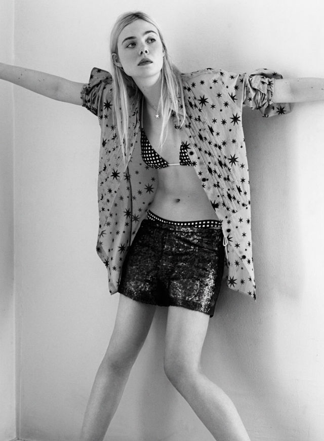 Ярко-голубые тени, покрытые веснушками щеки с розовыми пятнами румян, кулон-звездочка на груди между лямками купальника — трудно сказать, сколько лет Эль Фаннинг. Она уже воспринимается как вечная старлетка, постоянная надежда Голливуда, которой того и гляди стукнет 25, а мы все равно помним ее подростком. Но сестрицам Фаннинг, Дакоте и Эль, несмотря на такой ранний старт, все еще 20 и — о боже! — 16 лет соответственно.
