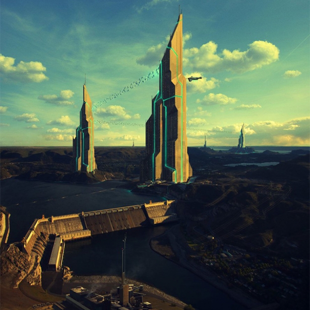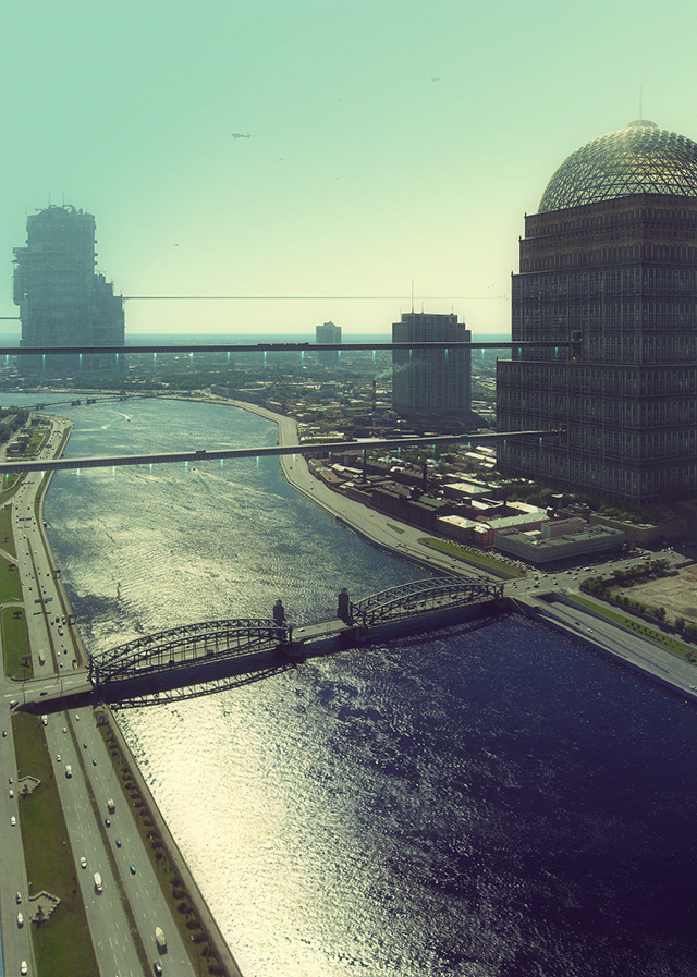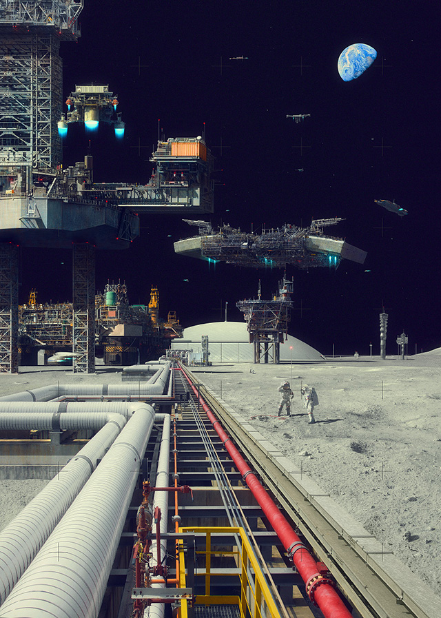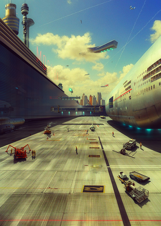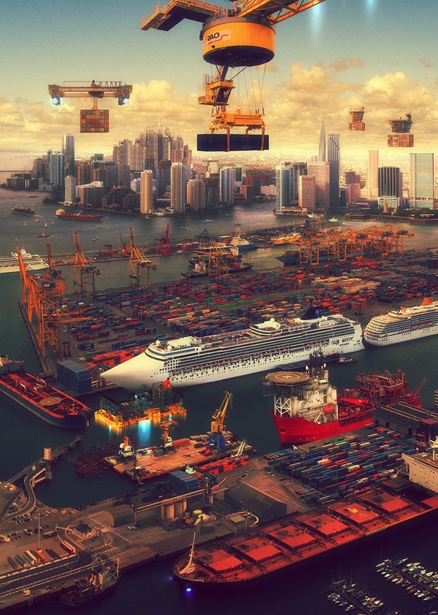 Иллюстрации кажутся привычной фантастикой, зарисовками к космической киноодиссее. Вот-вот прилетят пришельцы и все это разнесут. Но Евгений Казанцев руководствовался не столько собственной фантазией, сколько современными тенденциями в области технологий, науки и архитектуры. Почему бы дронам, в наши дни безобидно снимающим концерты и селфи, однажды не превратиться в летающие механизмы для погрузки кораблей? Разглядывая иллюстрации, каждый может предположить, насколько вероятны предложенные художником «виды на будущее».