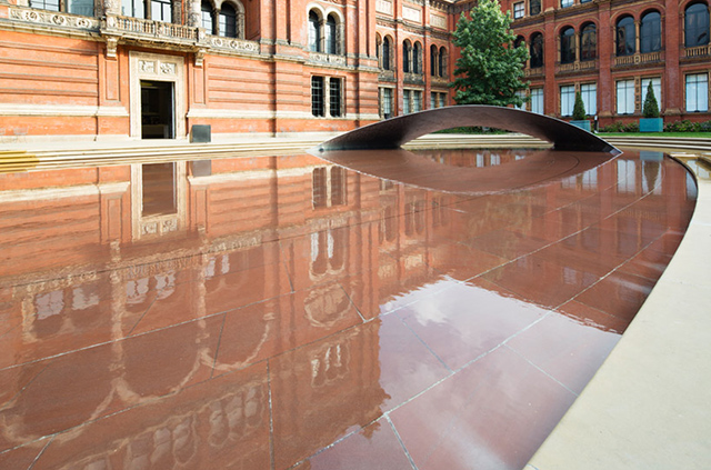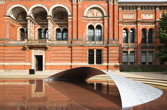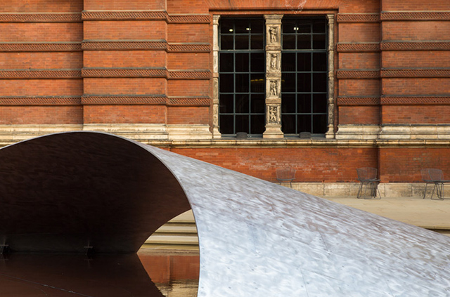 Новая инсталляция Захи Хадид напоминает то ли исполинскую ракушку, то ли пологий серебряный холм, окруженный водами бассейна во дворе V&A. Пластина, из которой "свернута" скульптура, была сделана настолько тонкой, насколько позволяют самые современные технологии. Серебристая поверхность отражает то, что ее окружает: небо, деревья, красные кирпичи знаменитого музея размытыми силуэтами появляются на выпуклом "экране" произведения Хадид.