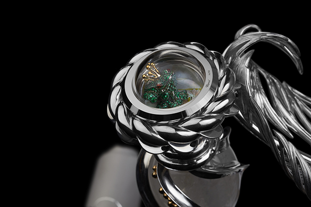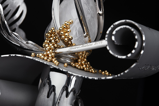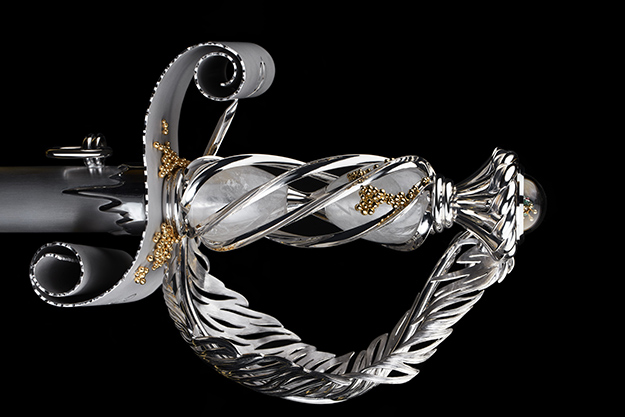 В этот раз необычный подарок взялась изготовить компания Chopard. Шпага создавалась при деятельном участии самого Макина и посвящена его любимому времени года — зиме. Над ней трудились 11 лучших мастеров Chopard, и не зря: рукоятка украшена россыпью из 500 изумрудов и 11 белых бриллиантов.