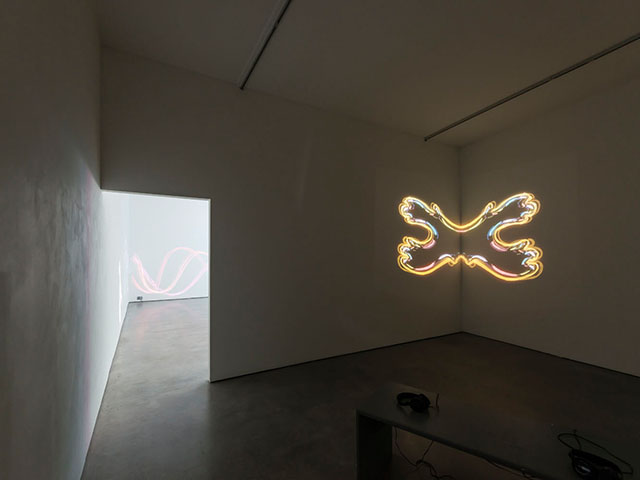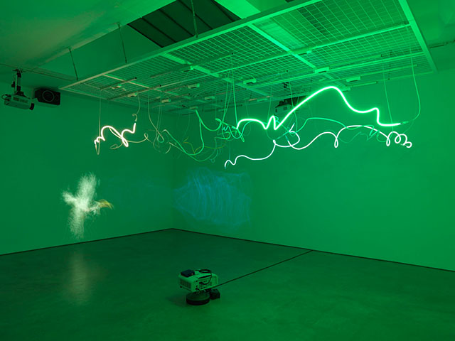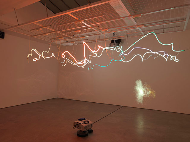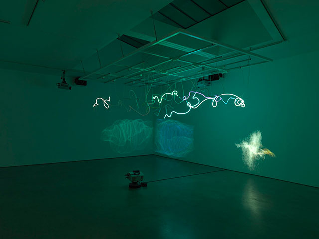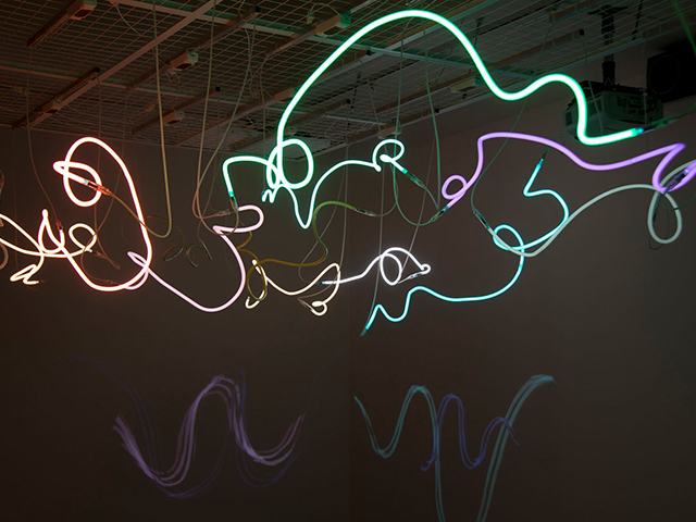 В центре лондонской экспозиции — инсталляция из двенадцати неоновых "извилин", свисающих с потолка. Каждая из них освещается и изменяет цвет, подчиняясь нотам и тонам потусторонних мелодий Ханса Берга, который более десятилетия создает музыкальное сопровождение к арт-объектам Юрберг. Атмосферу дополняют три видеопроекции — абстрактная анимация, рисованная карандашом. А по стенам кружит изображение долговязой птицы из мультфильма. В общем, фантазии представителям шведского современного искусства не занимать.