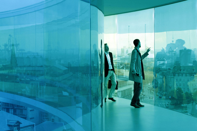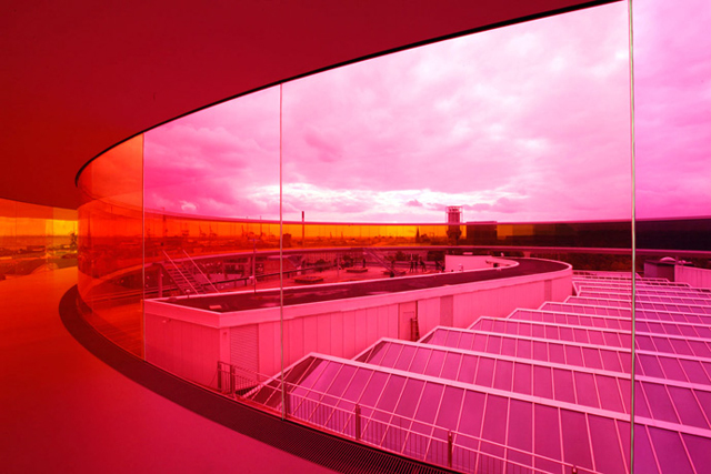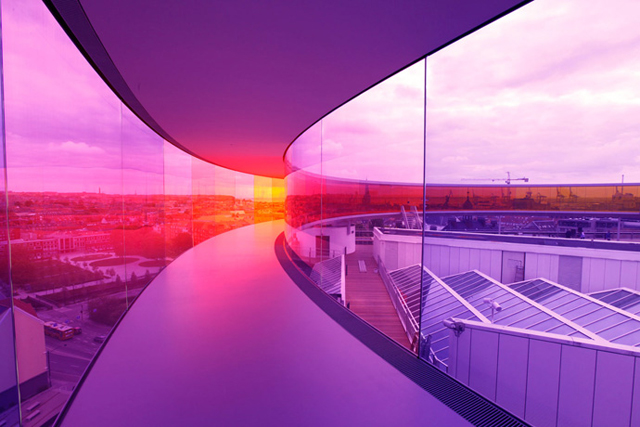 Радужная панорама датско-исландского светохудожника Олафура Элиассона, установленная на крыше музея ARoS, притягивает посетителей как магнит — где еще можно прогуляться по круговой площадке, открывающей 360-градусный обзор на город сквозь цветные стекла? Эту надстройку в городе Орхус, которая появилась в начале 2011 года, считают одной из главных причин возросшей популярности музея современного искусства.