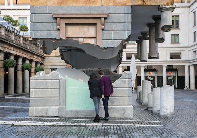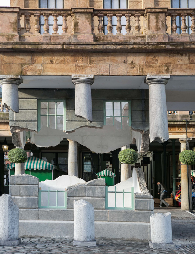 Британец Алекс Чиннек продолжает играть с архитектурой сооружений на лондонских широтах: то он кладет дом на бок, то переворачивает его вверх тормашками, то как будто ударяет шаровой молнией посередине, оставляя часть здания парить в воздухе. Именно такая инсталляция сейчас выставлена на старинной площади около входа в Covent Garden Market.