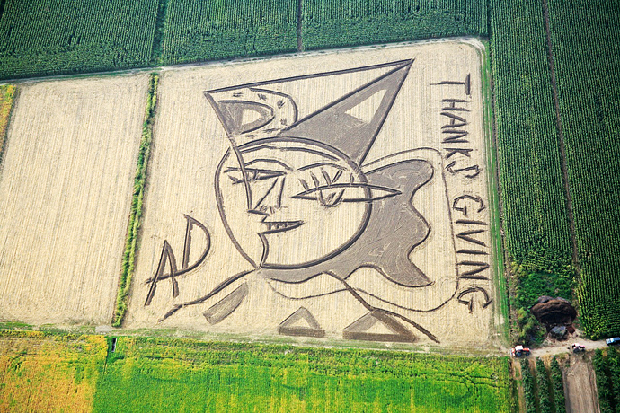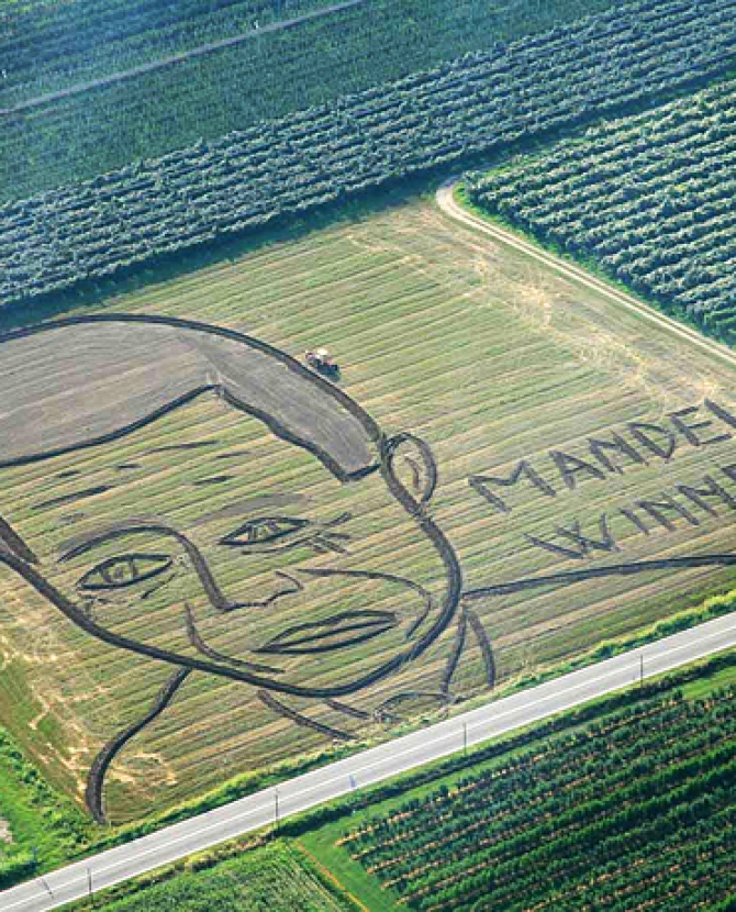 Итальянский land-art-художник Дарио Гамбарин примечателен тем, что пишет гигантские портреты Обамы или Нельсона Манделы, создает репродукции картин Эдварда Мунка или Пабло Пикассо — а в качестве холста и кисти использует поле и плуг.