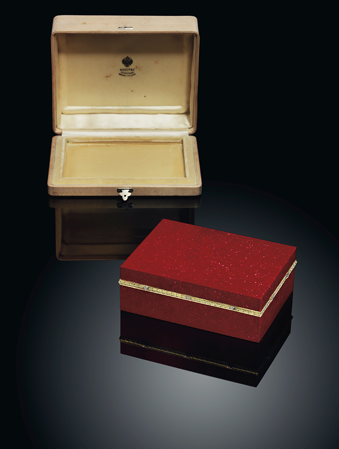 Большая шкатулка из пурпурина, украшенная драгоценными камнями в обрамлении двухцветного золота.