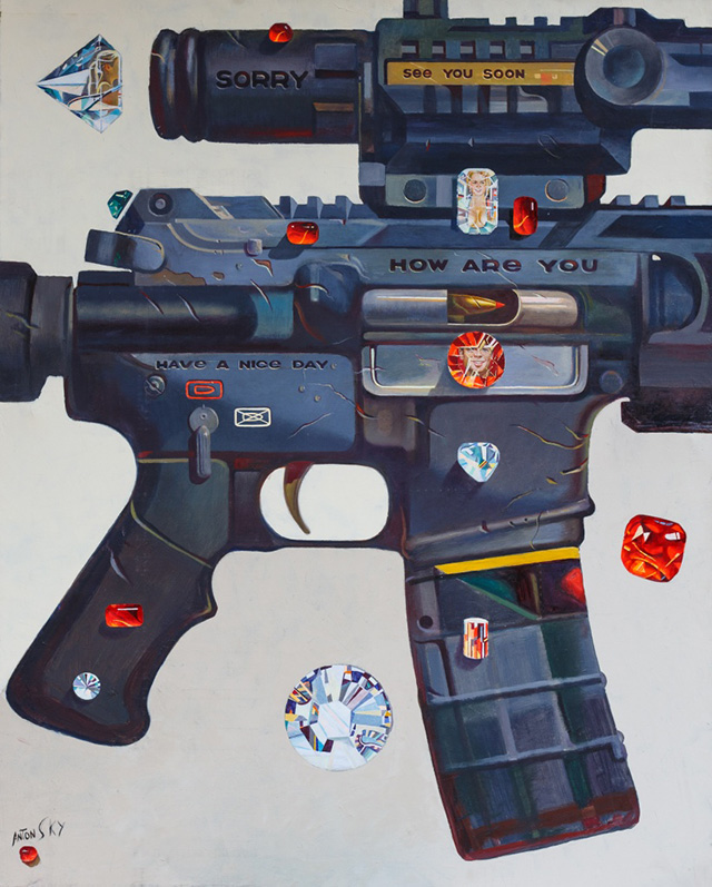 В рамках разработанной Антоном Кандинским концепции символического сюрреализма, героями его картин становятся боеприпасы и автоматы Калашникова, раскрывающие злободневную тему войны и мирового устройства. Ручные гранаты защитного цвета на фоне алмазного черепа украшают кровавые, как слезы, рубины, в то время как золотая чека скандирует Love me и La Roulette en Rose. Или автомат Калашникова с магазином, успыпанным цветными драгоценными камнями, надписью Best Buy на цевье и стволом с фатальной фразой From Russia with love.