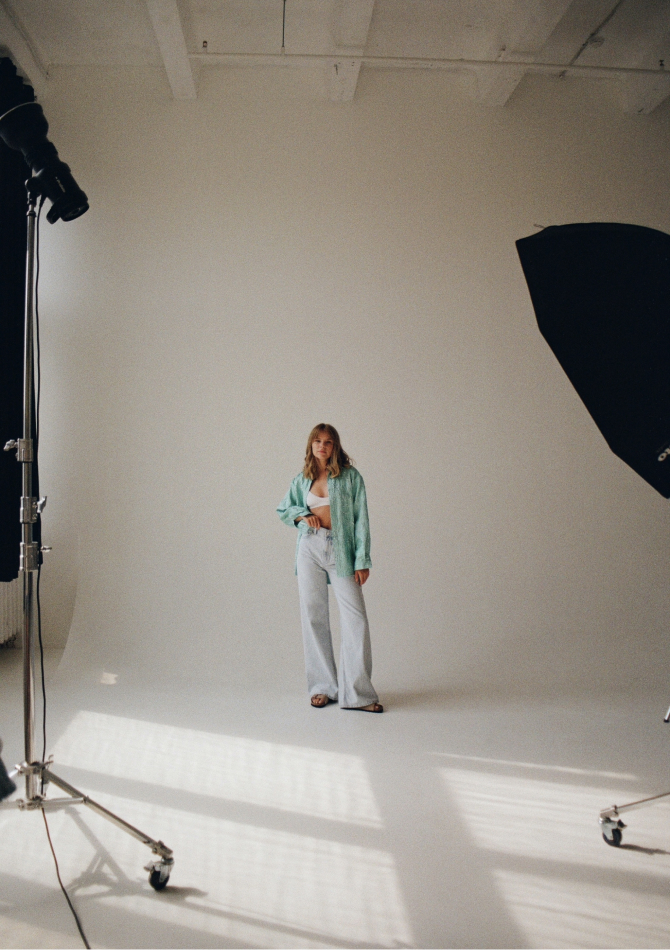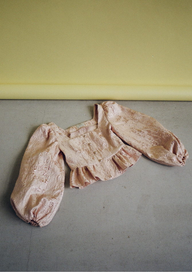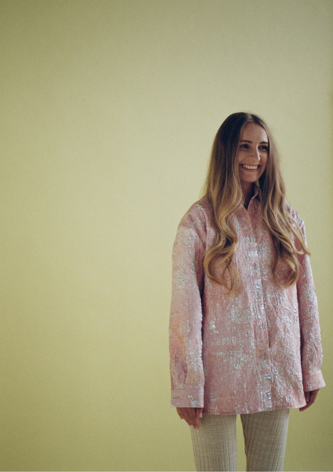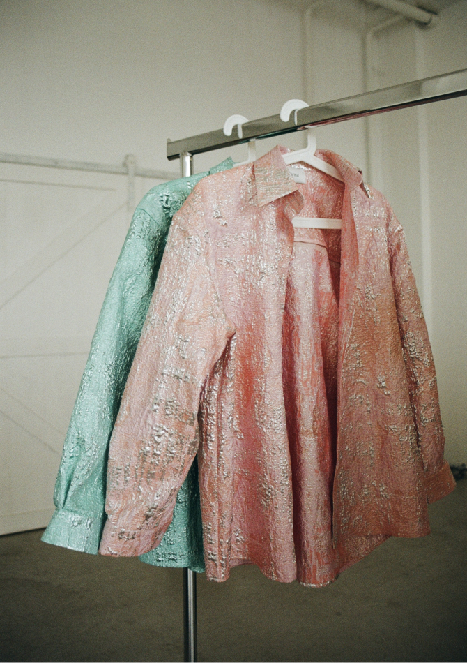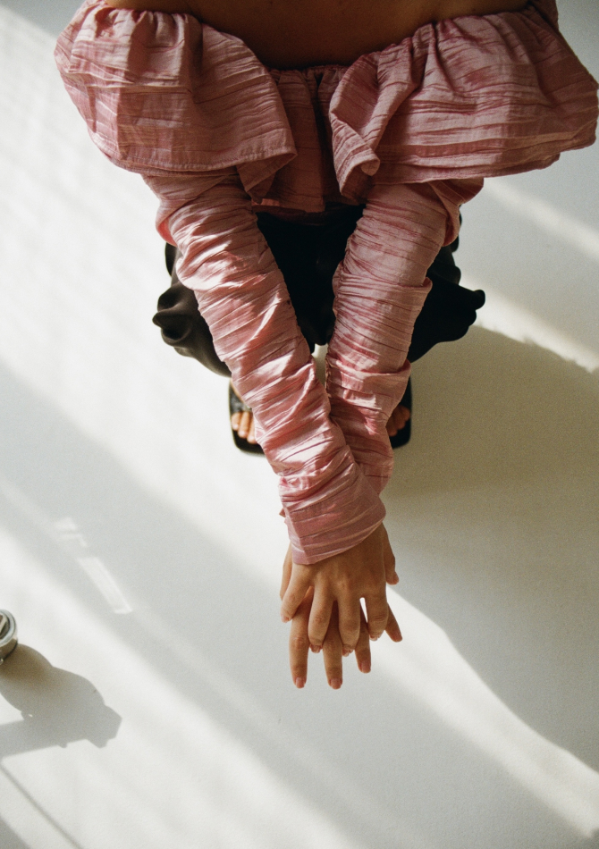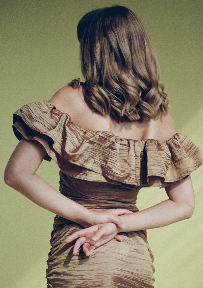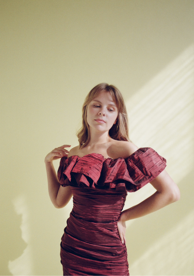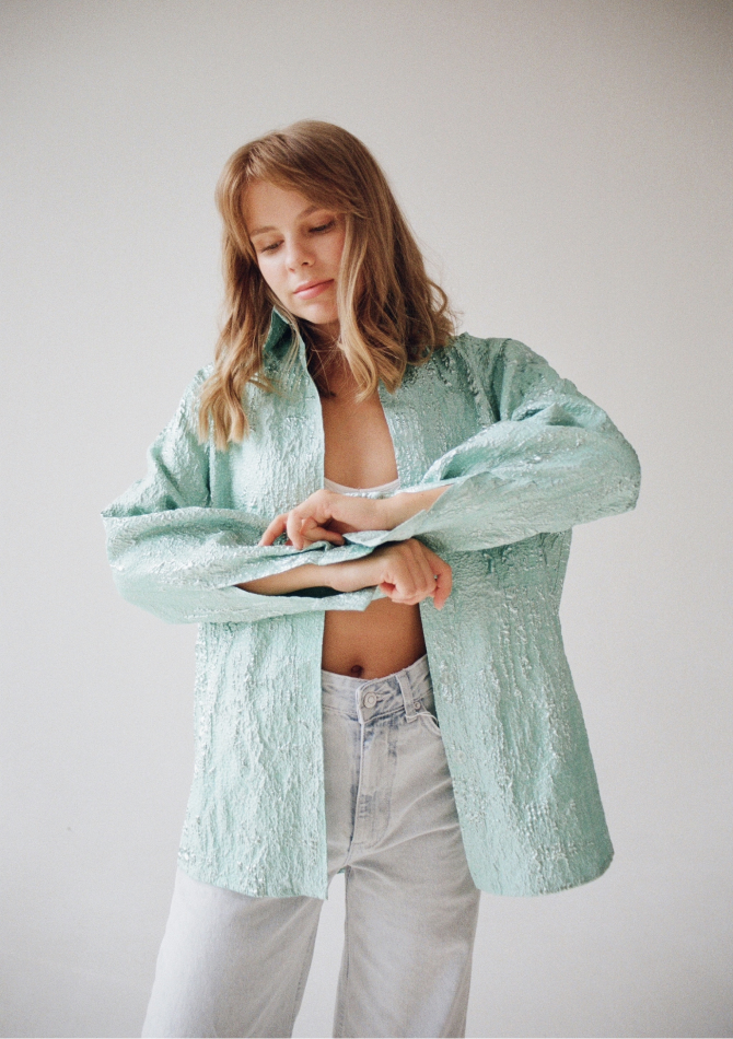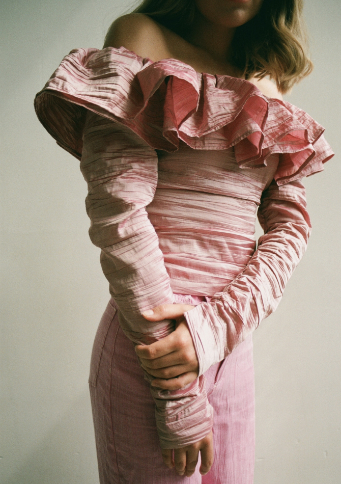 В капсулу вошли золотисто-персиковый топ на пуговицах с пышными рукавами, топ из нежно-розовой тафты, платья с открытыми плечами бордового и имбирного оттенков, подчеркивающих загар, а также рубашки с длинным рукавом из бирюзового и серебристо-розового жаккарда. Их предлагается носить с купальниками в жару и с джинсами в прохладную погоду.
