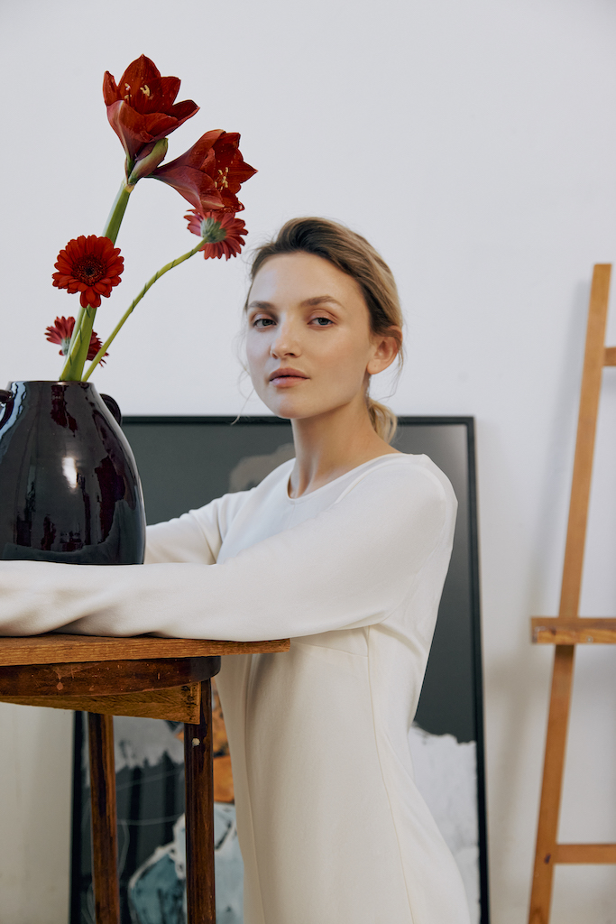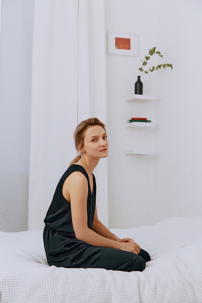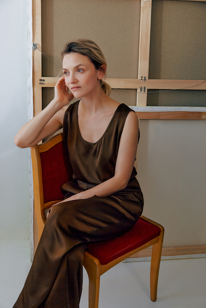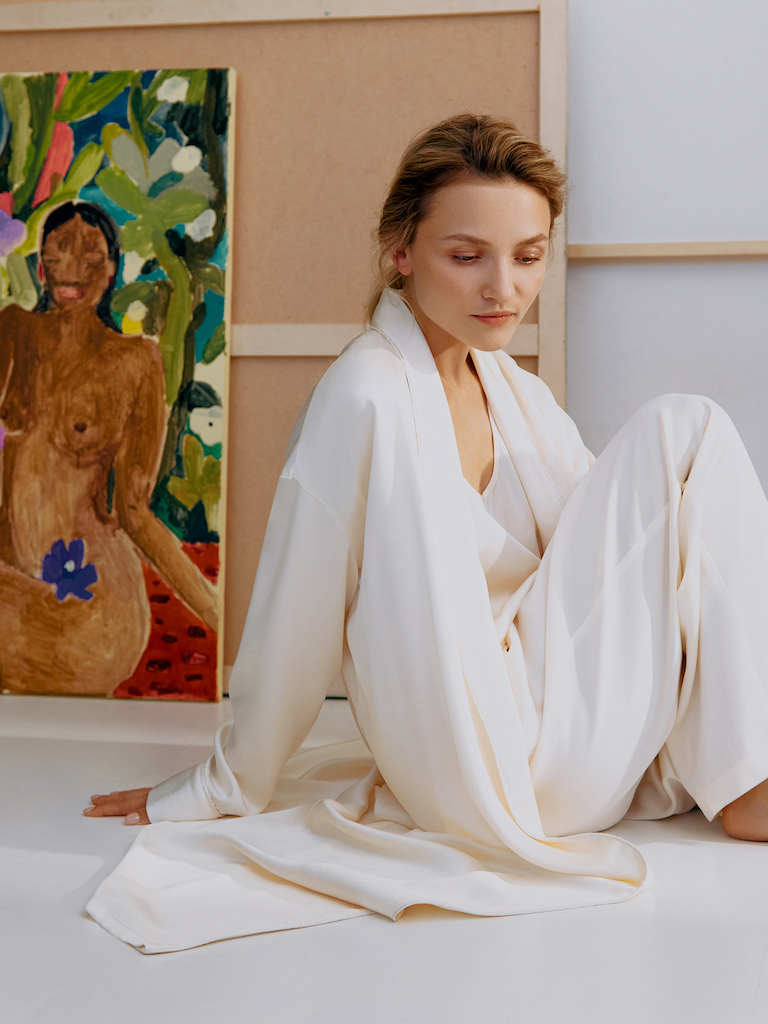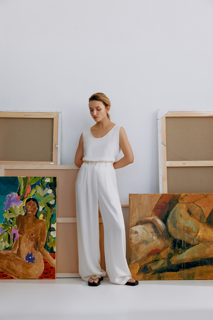Капсулу представила художница Алена Ракова. Она примерила топы с широкими бретелями, минималистичные платья, блузы и брюки в пижамном стиле, юбки с разрезами и длинные накидки-халаты.