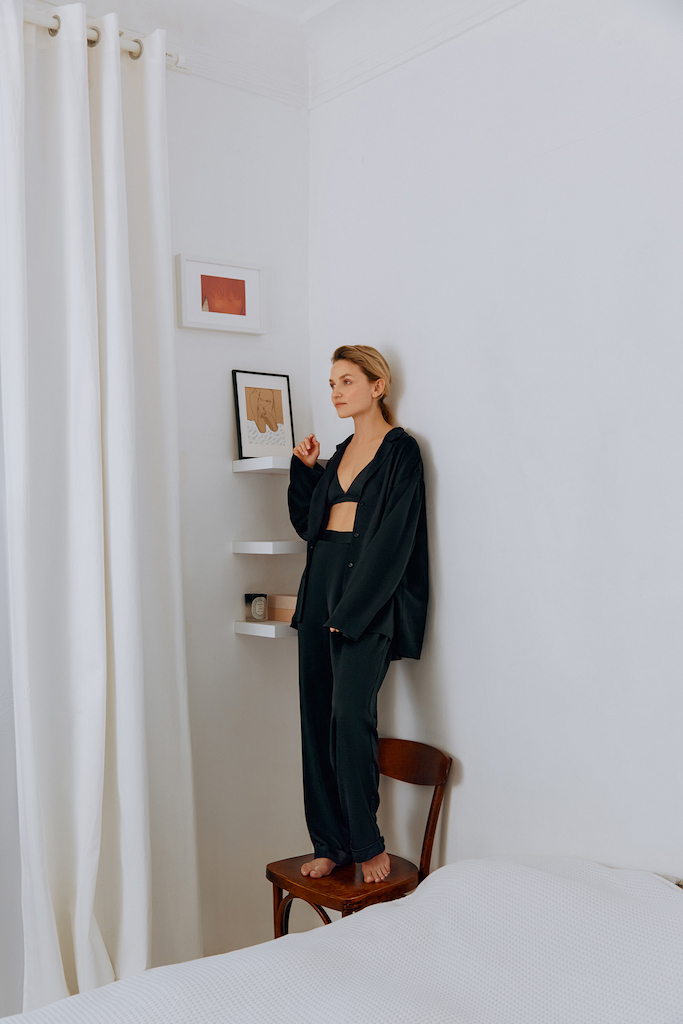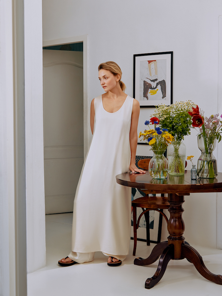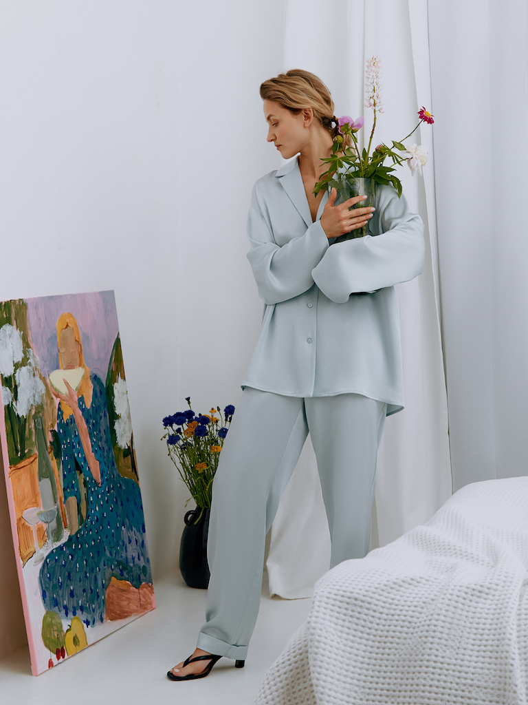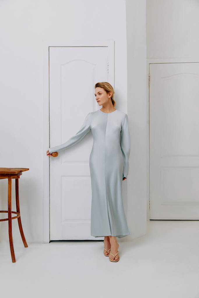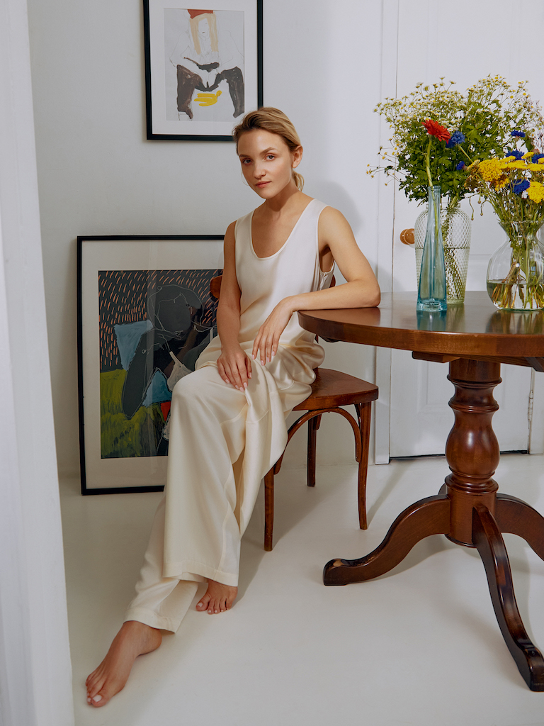 Капсулу представила художница Алена Ракова. Она примерила топы с широкими бретелями, минималистичные платья, блузы и брюки в пижамном стиле, юбки с разрезами и длинные накидки-халаты.