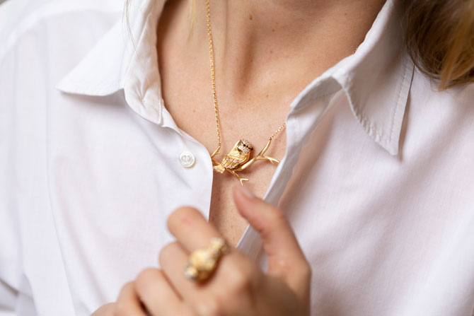 Новым персонажем дома стала синица The Chickadee, она украшает колье, браслеты и кольца. В бестиарии Boucheron она воплощает юность, спонтанность и верность — это самый милый талисман на счастье. Фигурка птички украшена бриллиантами, ее глазки сделаны из черного сапфира, а блестящие перышки — из желтого золота.
