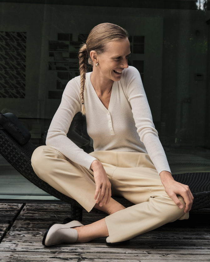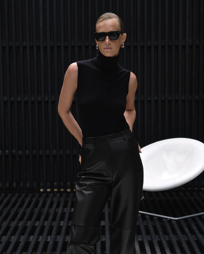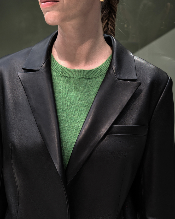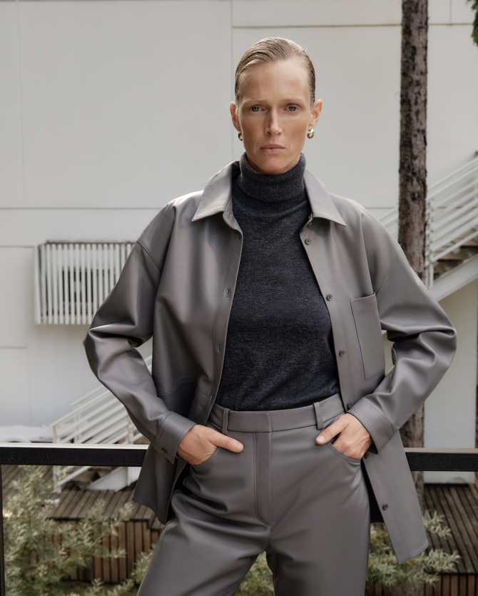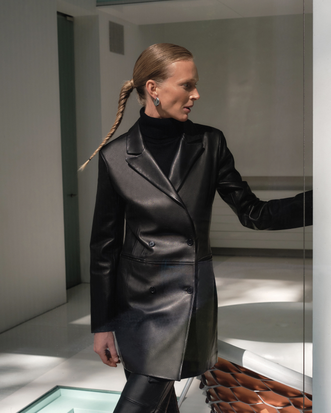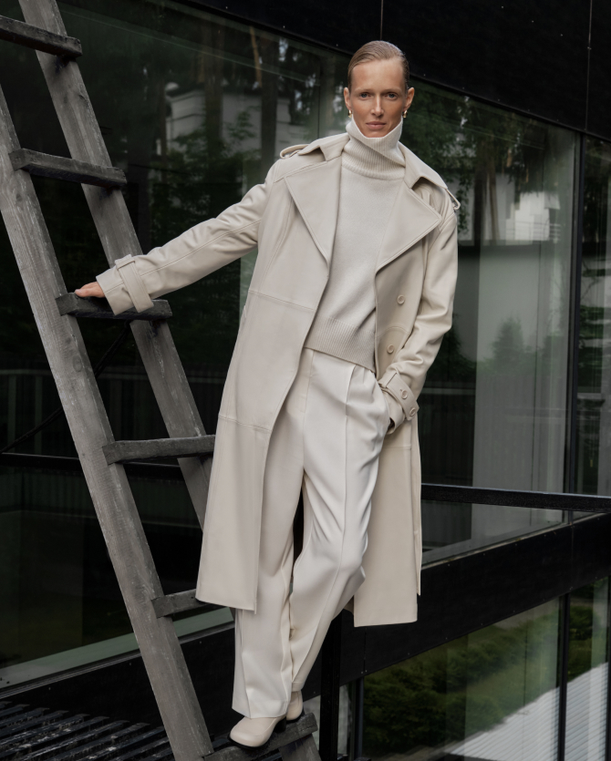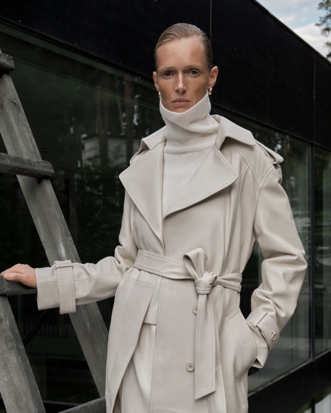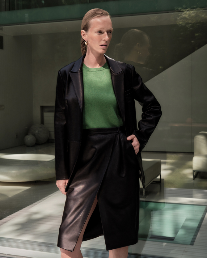 Бренд 12Storeez представил премиальную капсульную коллекцию из натуральной кожи ягненка. В нее вошли рубашка, прямой и приталенный жакеты, платье с крупными карманами на груди, юбка-миди с разрезом, свободные брюки и классический двубортный тренч. Их предлагается сочетать с тонкими водолазками, кашемировыми свитерами и минималистичными украшениями из золотистого металла.