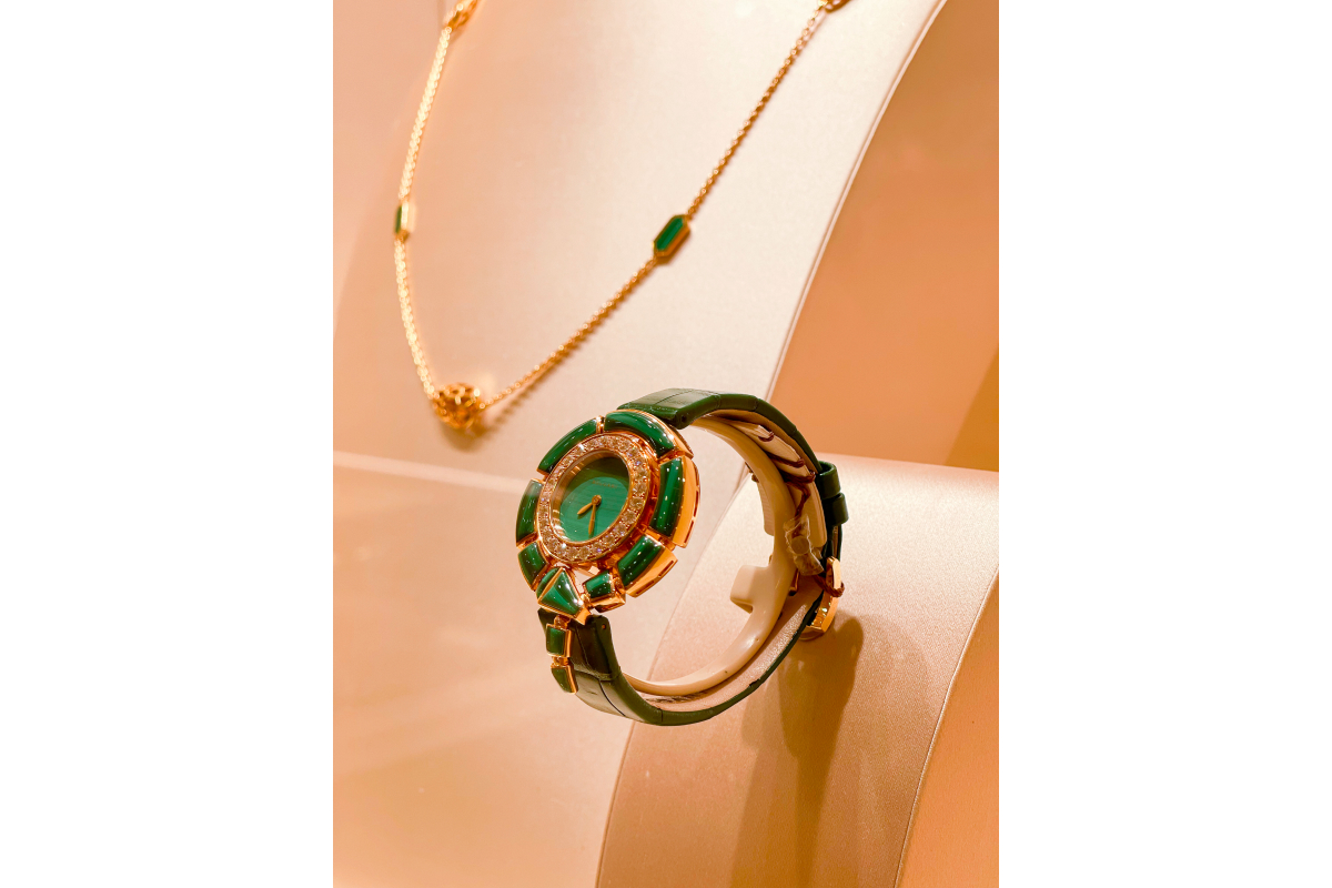 В пространстве представлены мужские и женские часы, украшения из ювелирных линий Serpenti, B.Zero1, Bvlgari Bvlgari, а также лимитированная коллекция аксессуаров Bvlgari Resort.
