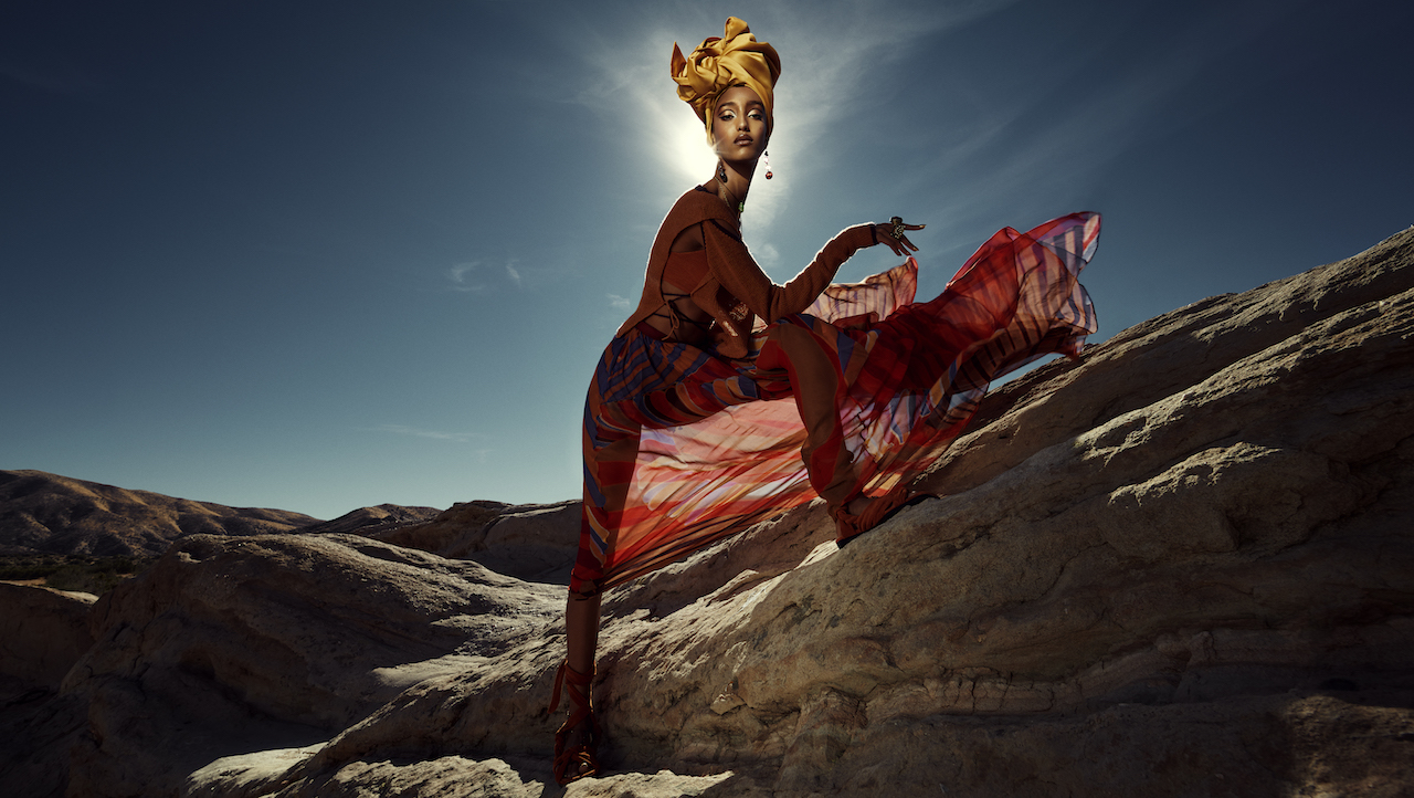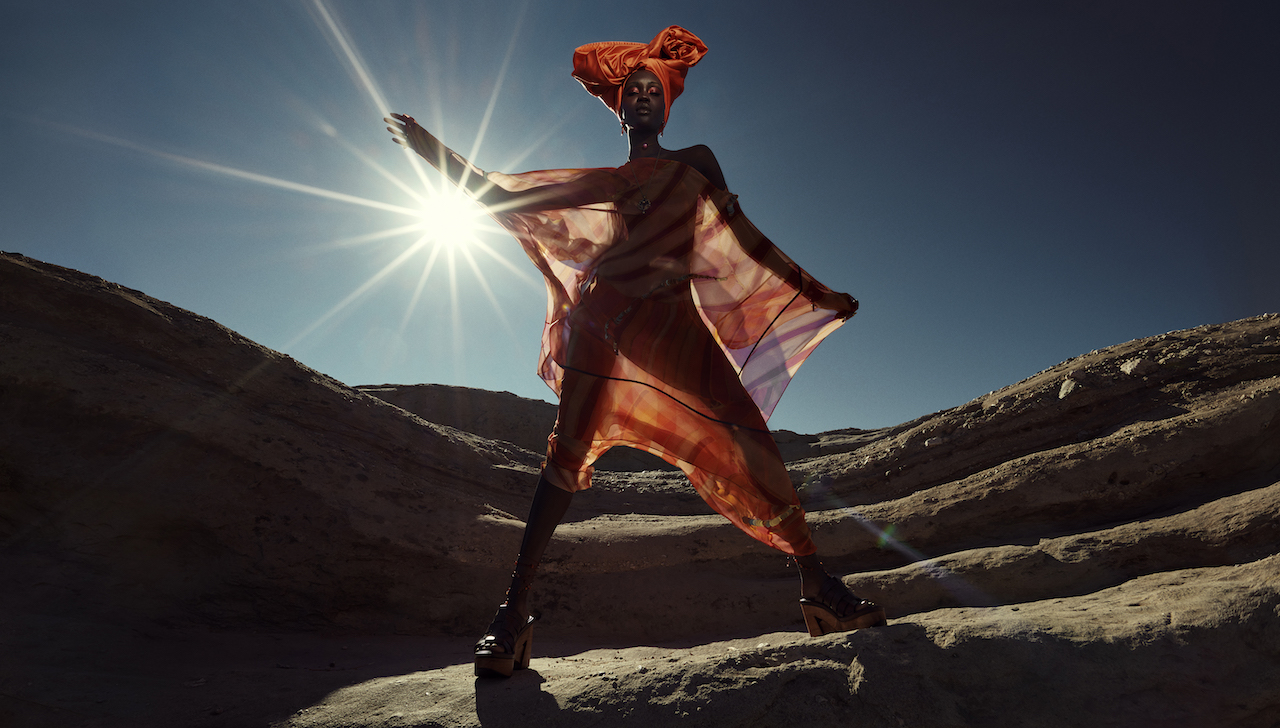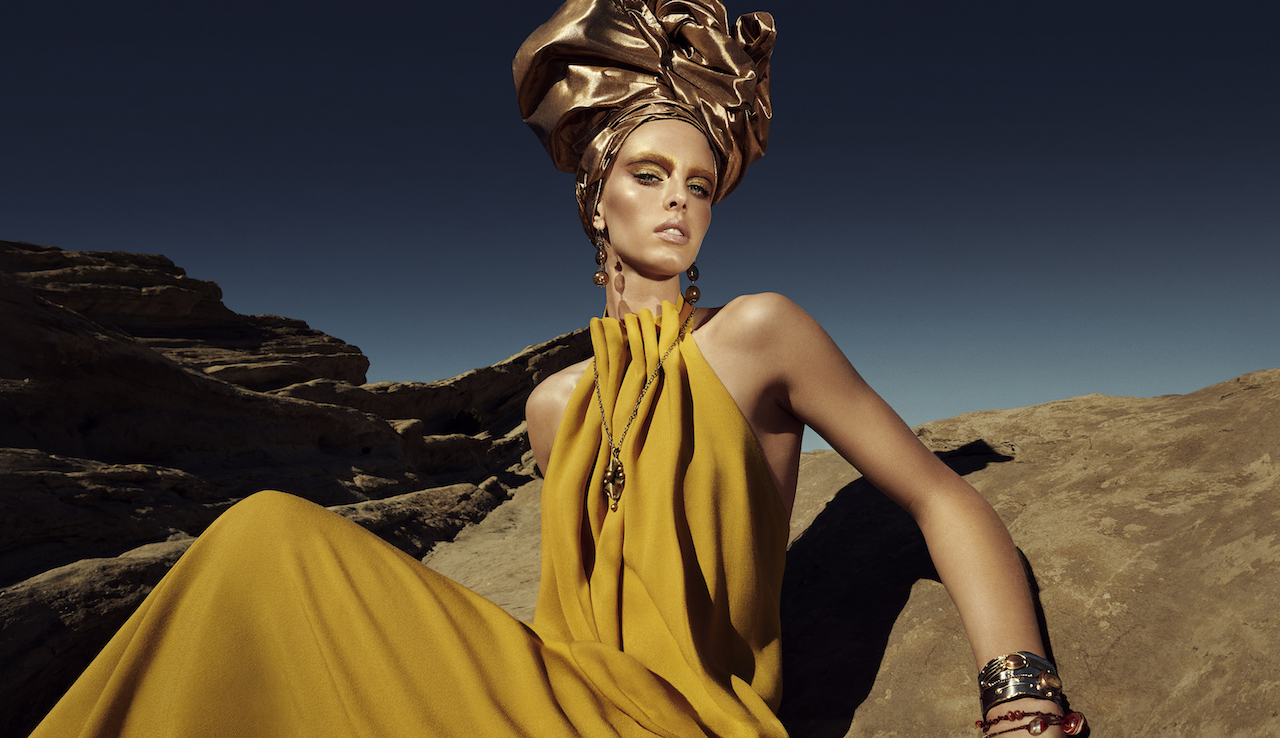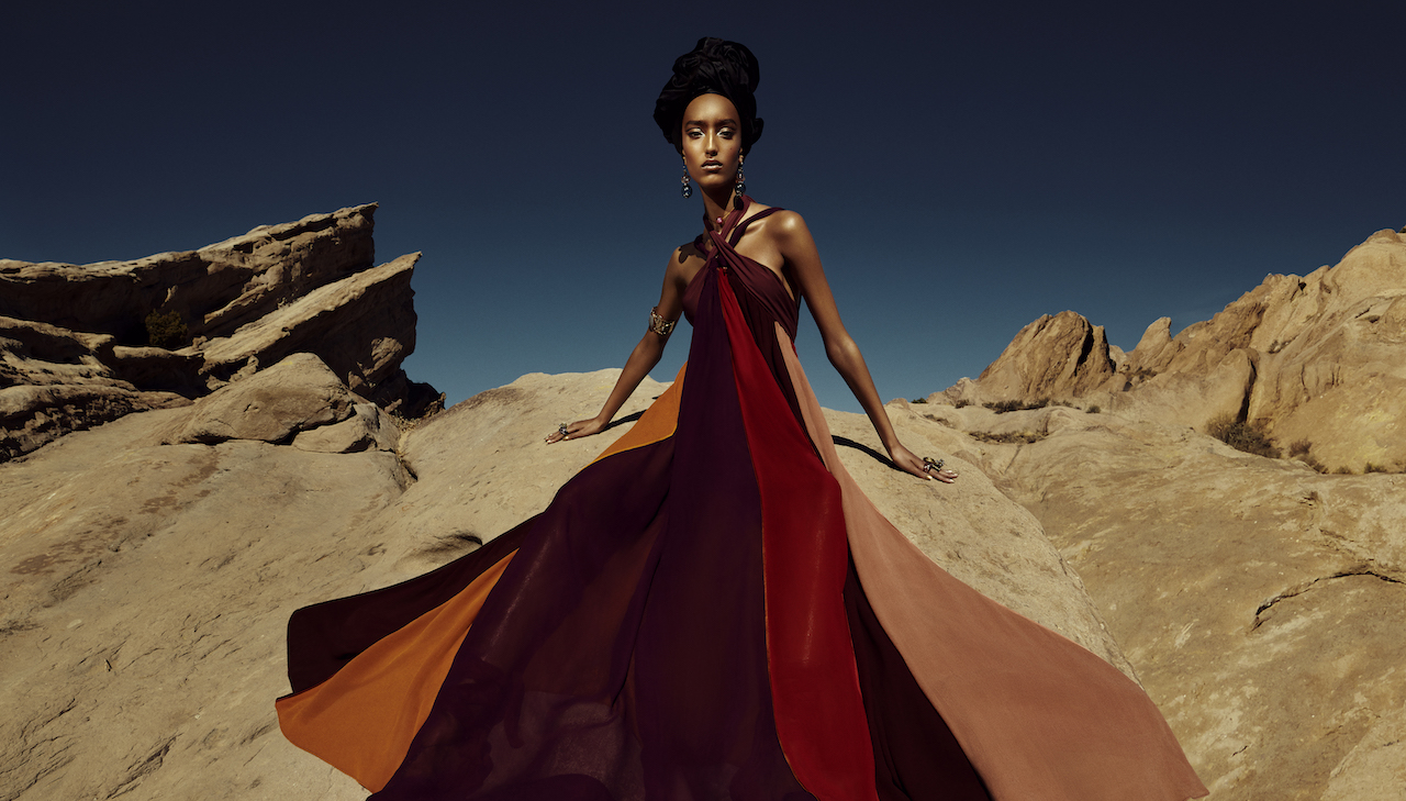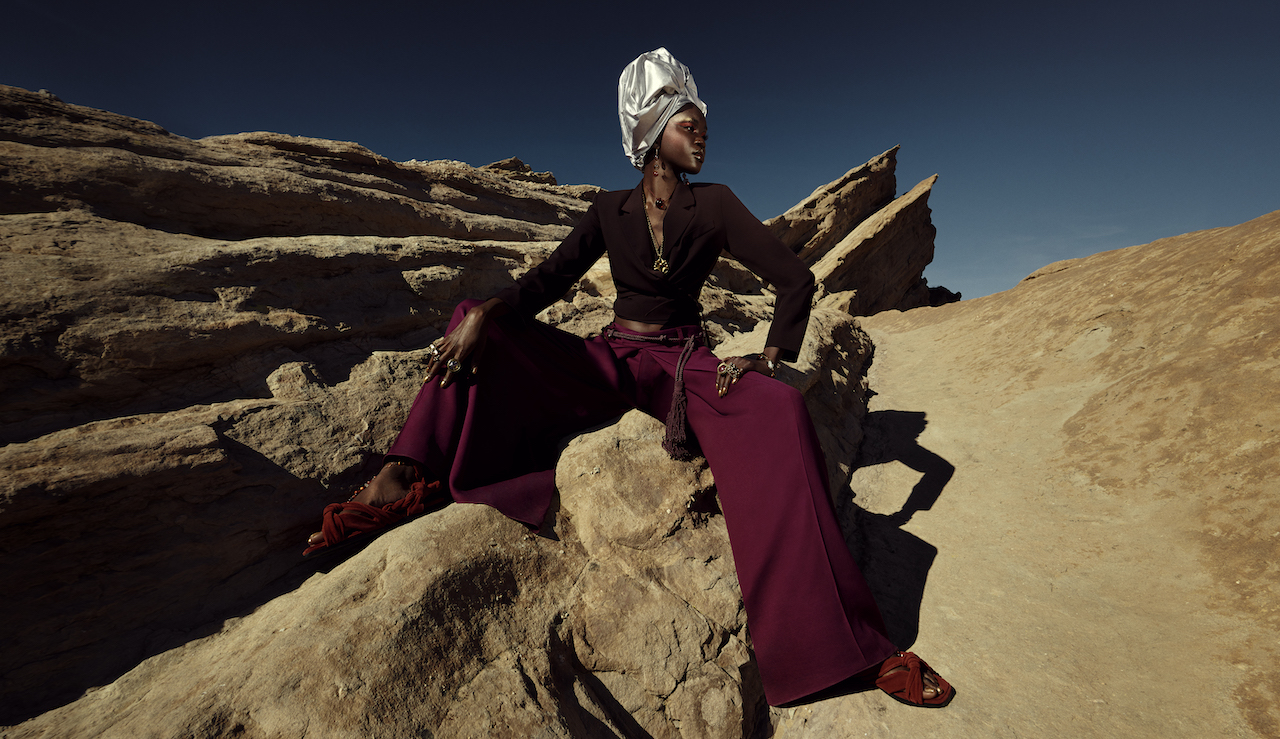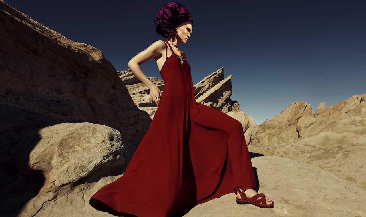 На опубликованных кадрах модели Эбби Чемпион, Ахенрин Мадит, Мона Тугаард примеряют платья из струящейся вискозы, топы из смесового льна, брючные костюмы, сабо на деревянной подошве и украшения в этническом стиле на фоне синего неба, жаркого солнца и скал в Калифорнийской пустыне. Их позы отсылают к модным съемкам 1970-х годов.