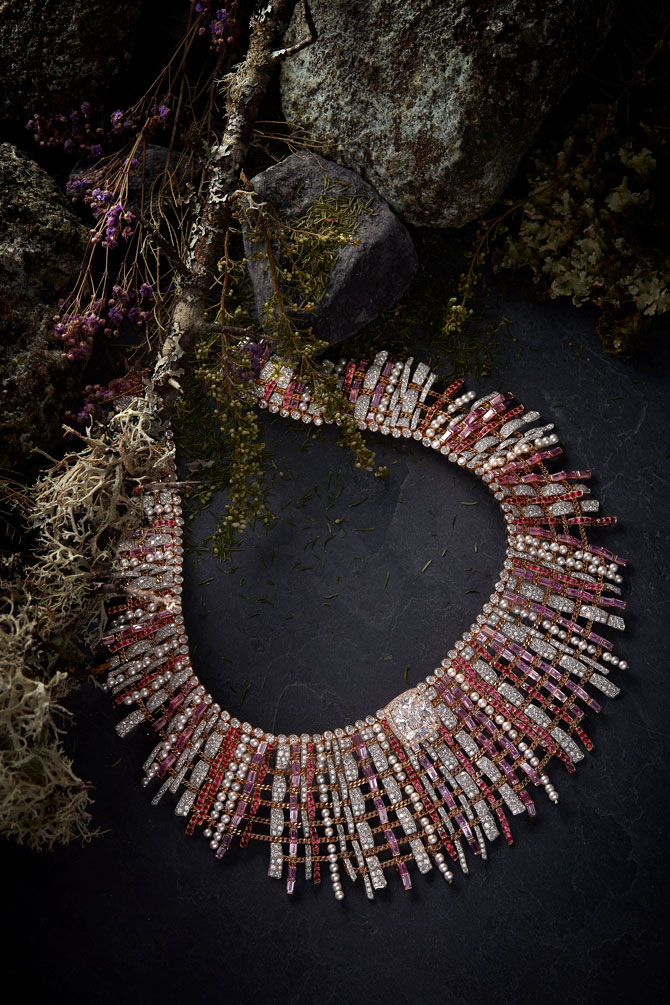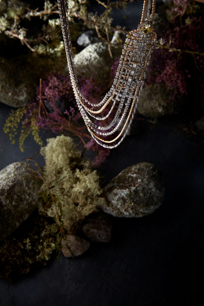 Бриллианты, жемчуг и сапфиры в колье, кольцах и браслетах Tweed de Chanel переплетаются в несколько слоев и действительно напоминают шерстяную материю. Коллекция из 45 исключительных украшений призвана воплотить в металле главные свойства твида.