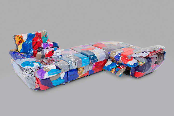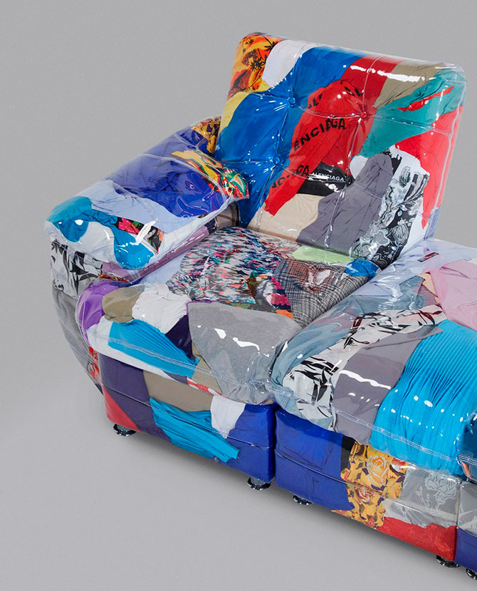 Гарри Нуриев из Crosby Studios создал диван из поврежденной и нераспроданной одежды Balenciaga. Этот предмет мебели представляет собой комбинацию из прозрачных виниловых секций, набитых текстилем.