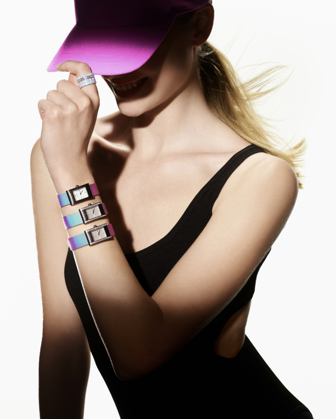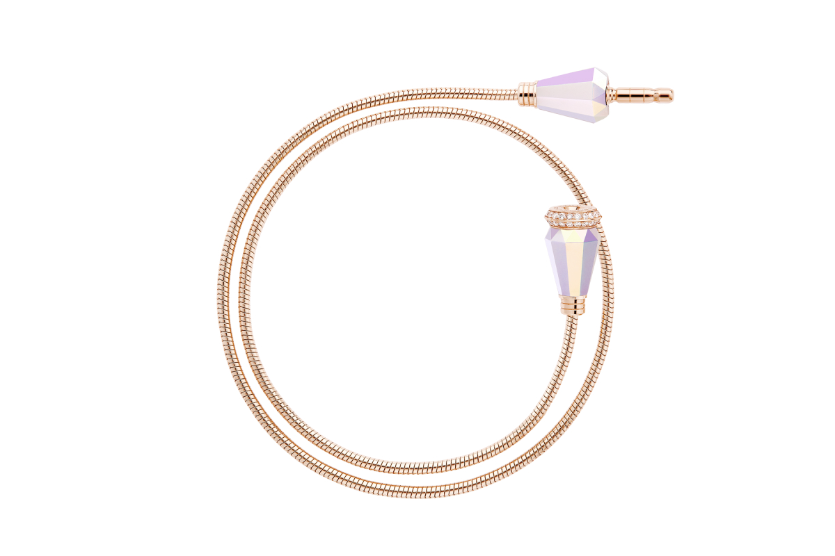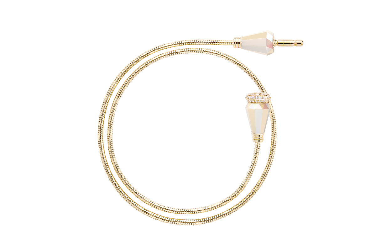 В капсулу вошли многофункциональные браслеты в два оборота из белого, желтого или розового золота с элементами из голографической керамики и бриллиантами, которые можно носить и как колье, а также набор брошей-«шипов», кольцо, часы с корпусом из стали и ремешком из кожи аллигатора.