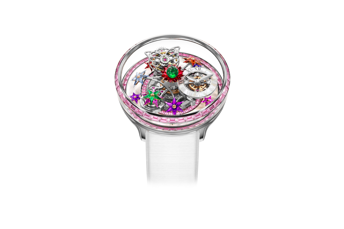 Бренд Jacob & Co. представил новые ювелирные часы Astronomia Fleurs de Jardin Rainbow с турбийоном в форме бабочки и сапфировыми цветами огранки «воздушный змей», расположенными поверх перламутрового циферблата. Модель получила 42,5-миллиметровый безель из 18-каратного розового золота с инкрустацией разноцветными сапфирами. В центре изделия находится зеленый цаворит, имеющий 288 граней в соответствии с фирменной огранкой Jacob & Co. Эти часы Fleurs de Jardin вышли лимитированным тиражом в 101 экземпляр.