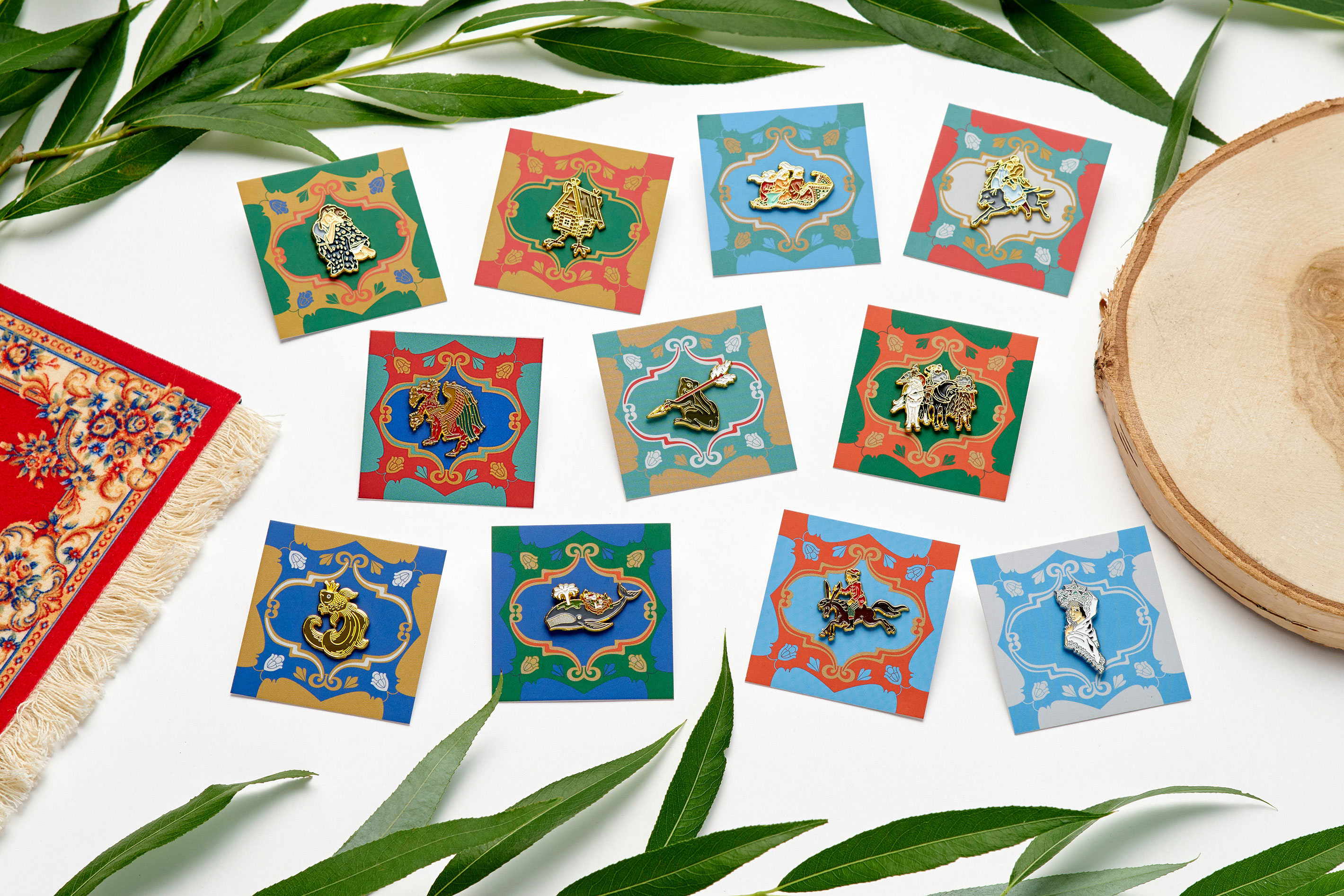 Всего в коллекции представлено одиннадцать значков со сказочными персонажами, среди которых — Царевна-лягушка, Золотая рыбка, избушка на курьих ножках, Змей Горыныч, Конек-Горбунок, Чудо-Юдо, Ковер-самолет, сестрица Аленушка, три богатыря, Царевна-лебедь и Иван-царевич. За основу некоторых образов были взяты знаменитые картины Виктора Васнецова и Михаила Врубеля, а также иллюстрации Ивана Билибина.