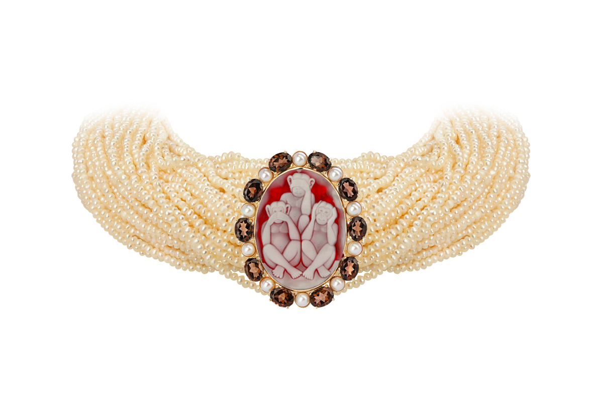 Ювелирный бренд Dzhanelli Jewellery представил новые украшения — серьги и чокер из классического желтого золота 585-й пробы с халцедоновыми камеями с символичными изображениями трех мартышек. Их окружают раухтопазы овальной огранки и жемчуг.