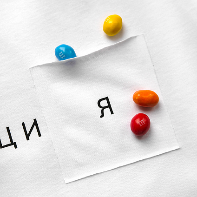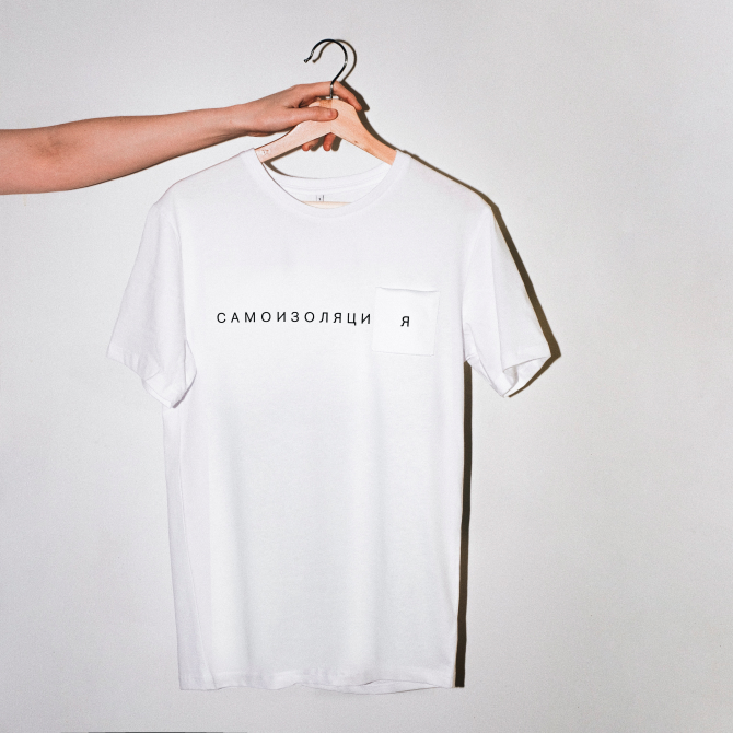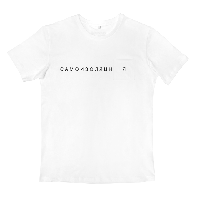 Музей современного искусства «Гараж» выпустил хлопковые футболки для тех, кто сейчас находится в режиме самоизоляции. На груди у них расположена надпись «Самоизоляция», где последняя буква хоть и обособленна от остальных, но «работает», так как находится на функциональном кармашке.