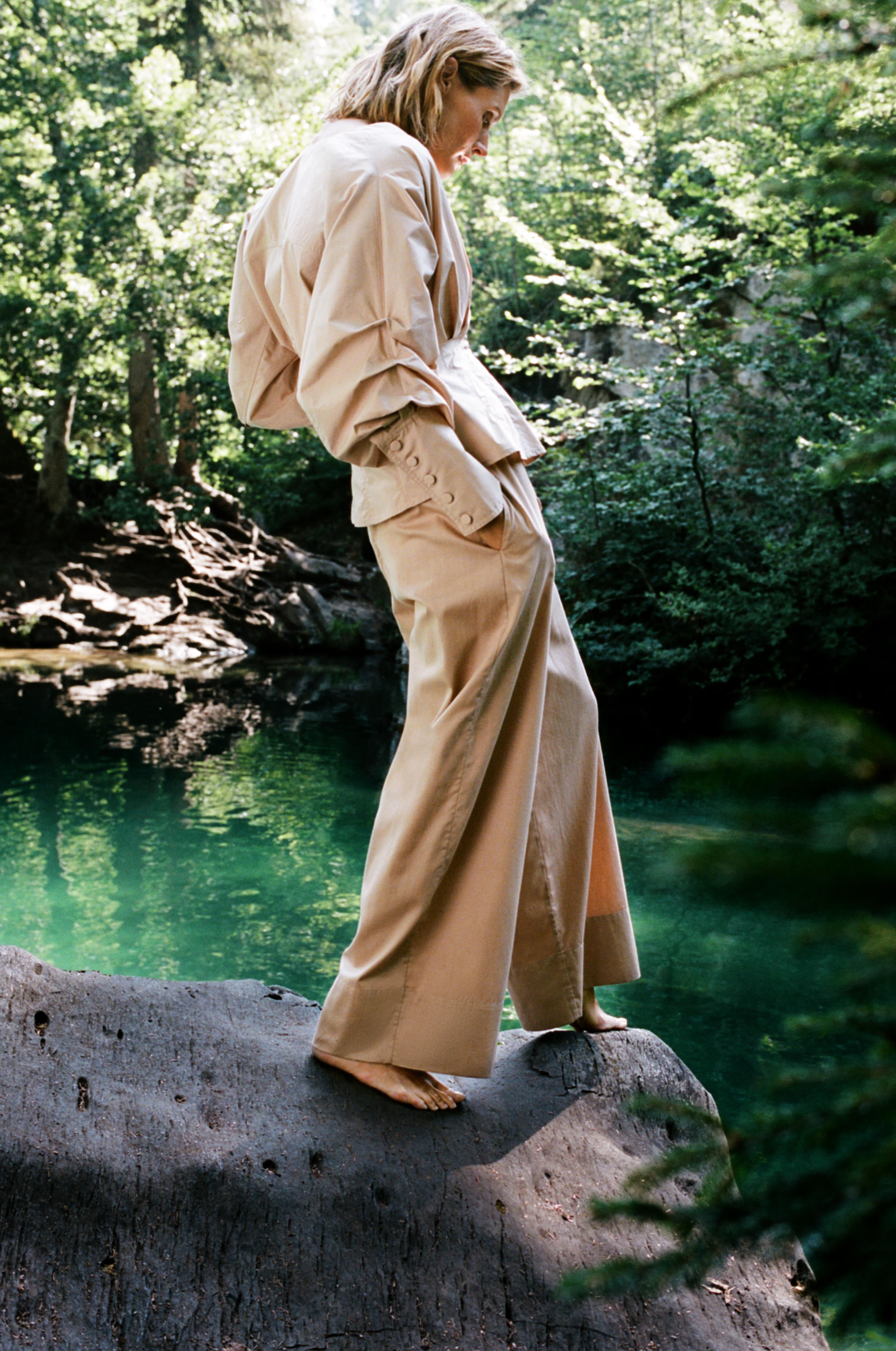 В капсулу вошли свободные платья, объемные рубашки, шорты и брюки. Все они изготовлены из органического хлопка и с учетом технологии управления водными ресурсами. В качестве основных цветов были выбраны песочный, хаки и насыщенный коричневый, оттененные белым и красно-оранжевым.