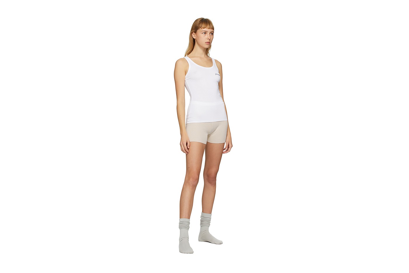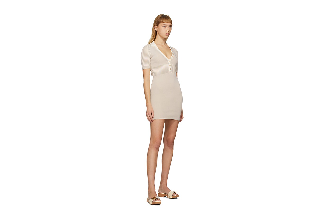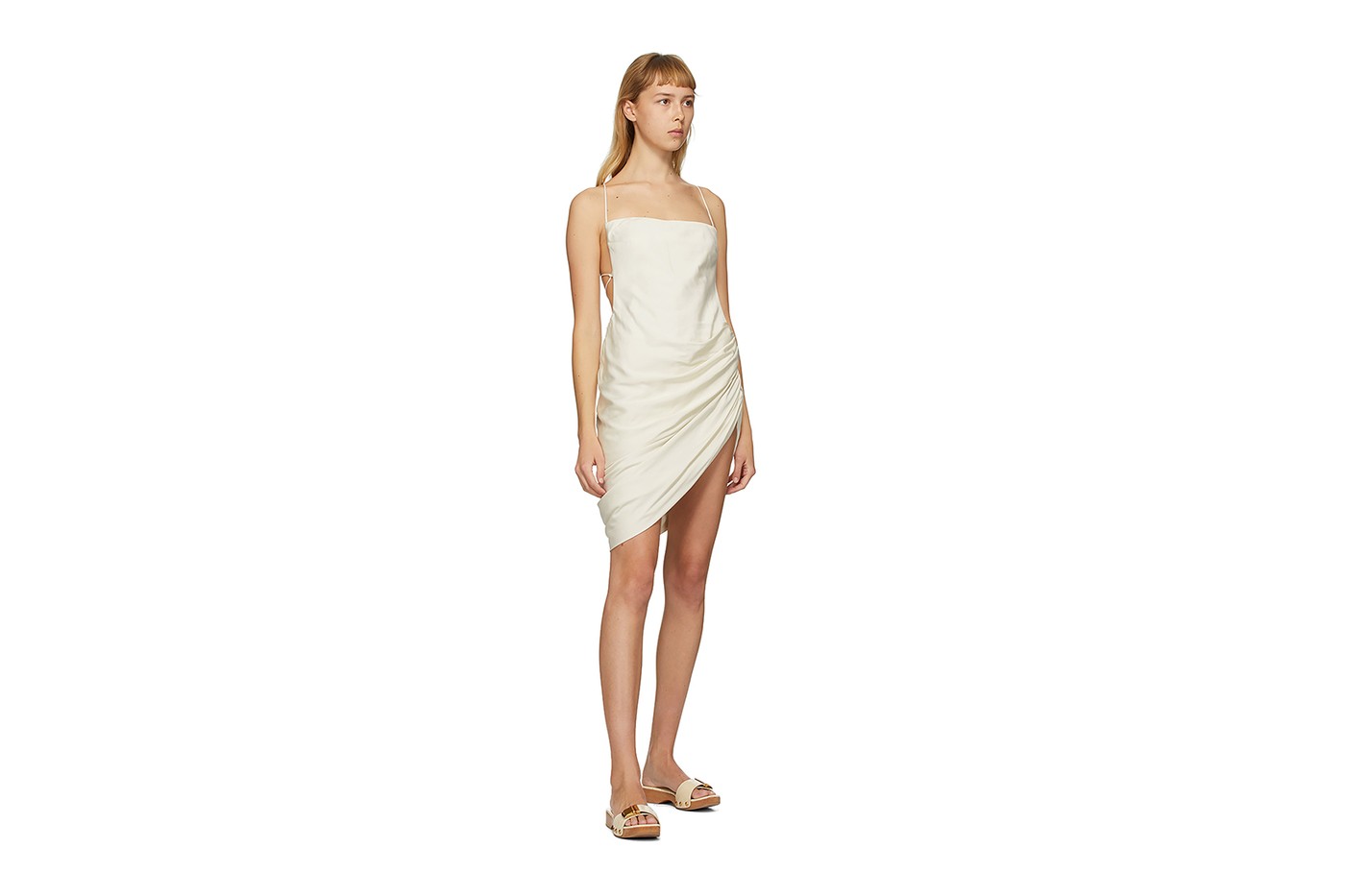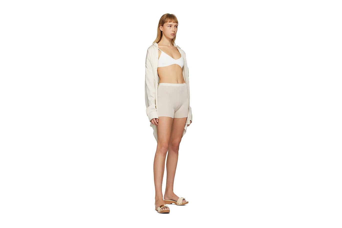 Jacquemus выпустил эксклюзивную капсульную коллекцию домашней одежды для ритейлера Ssense. В нее вошли футболки, майки, топы, платья, шорты и пара босоножек на деревянной подошве. Цветовую гамму составили белый и светло-бежевый.