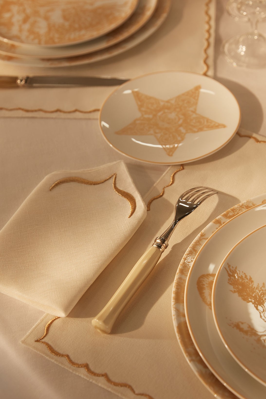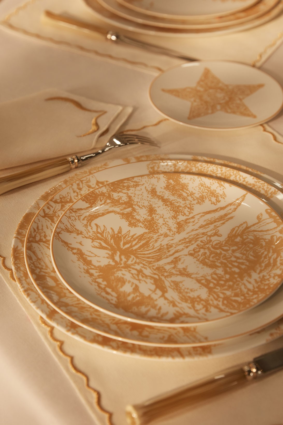 Dior Maison представил рождественскую коллекцию Mythological Star. В нее вошли наборы столовых и десертных тарелок из лиможского фарфора, свечи, подносы, а также блокноты и елочные игрушки. Об этом сообщает Hypebae.