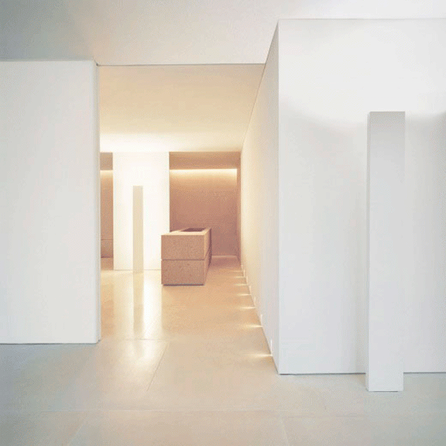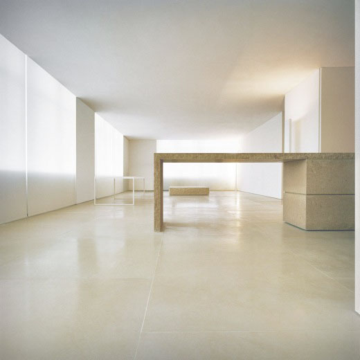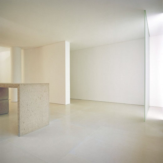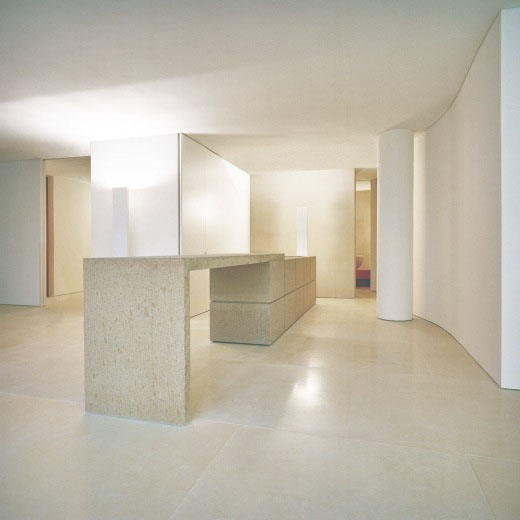 Интересным архитектурным решением проекта является отсутствие дверей между комнатами: дневные и ночные зоны непрерывно переходят друг в друга. Для создания интерьера были использованы лишь два материала — французский известняк и древесина груши. Предметы освещения и мебель также выполнены по дизайну Клаудио Сильвестрина.